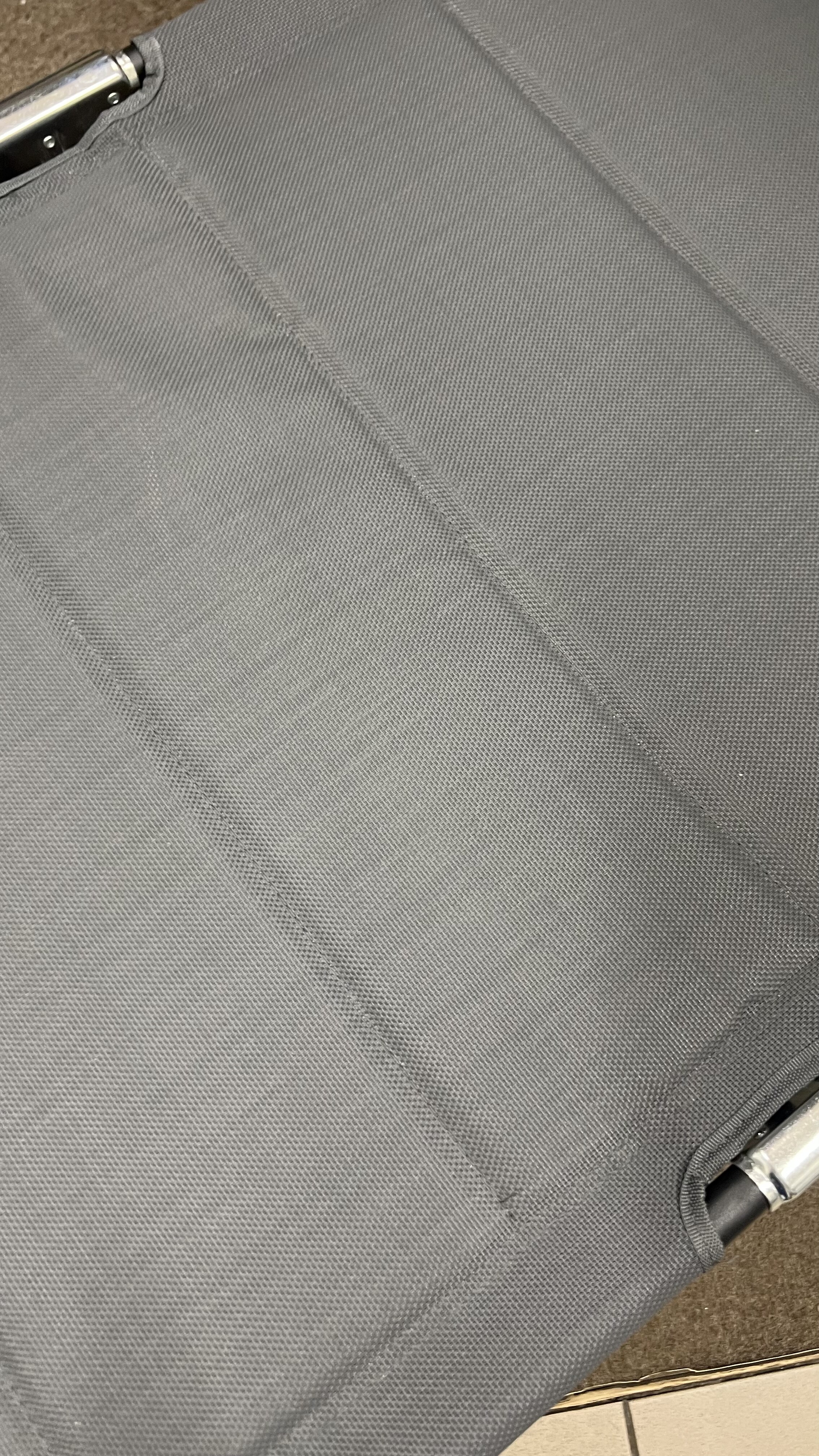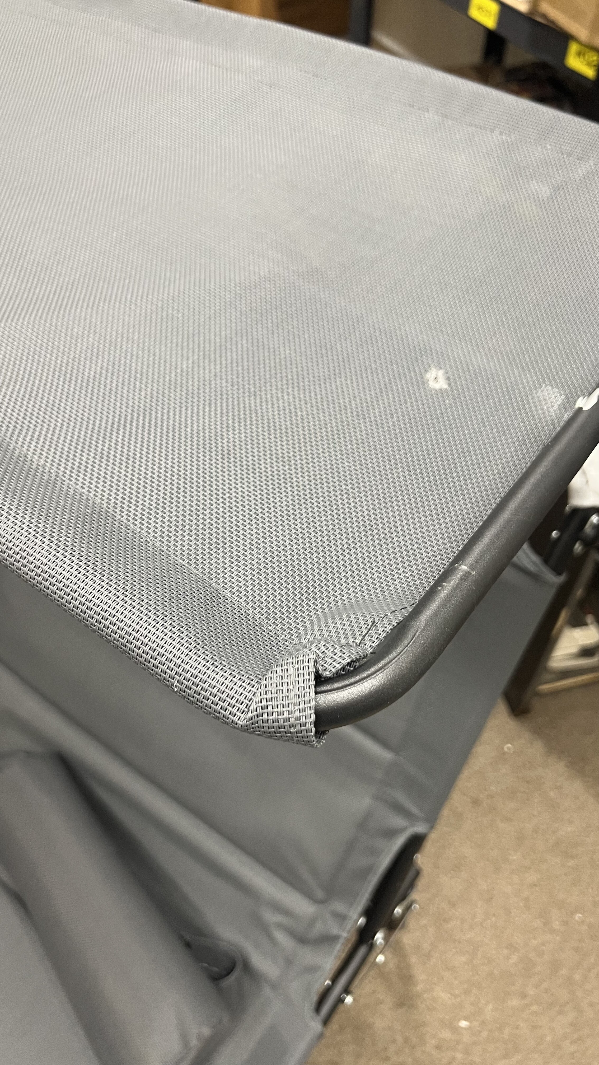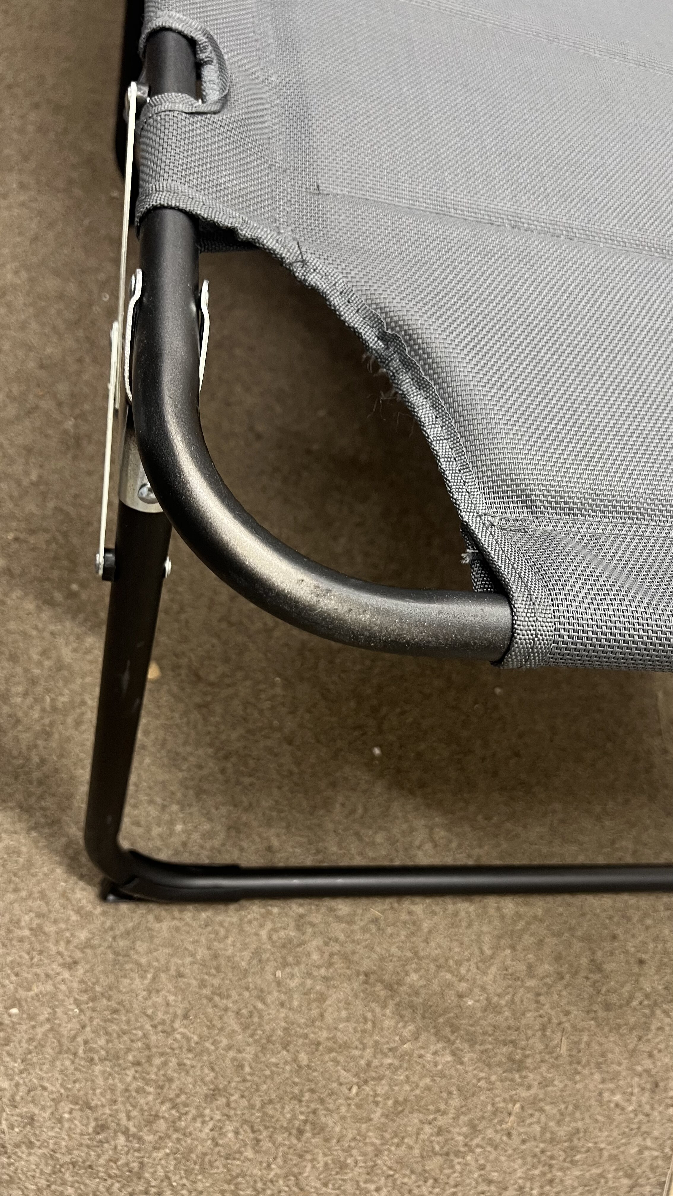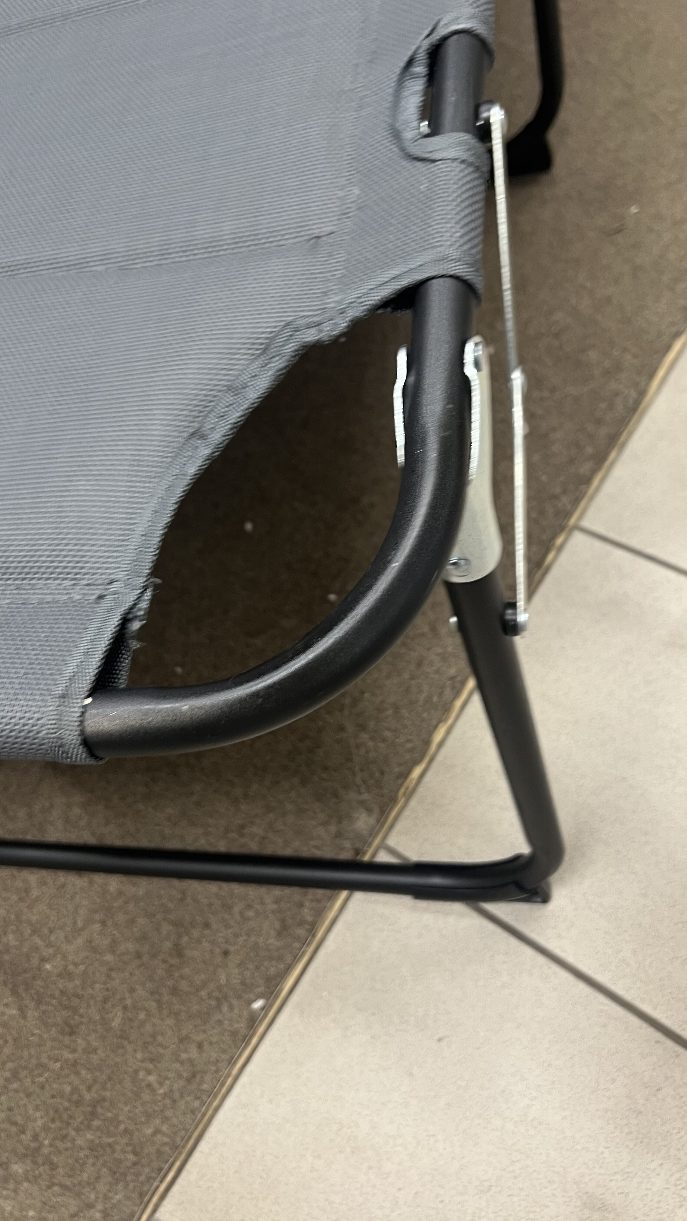 Toto lehátko má drobné nedostatky – na rámu se místy odlupuje barva, konstrukce je místy podřená a ve stříšce je menší díra. Na jeho funkčnost ani pohodlí to však nemá vliv.