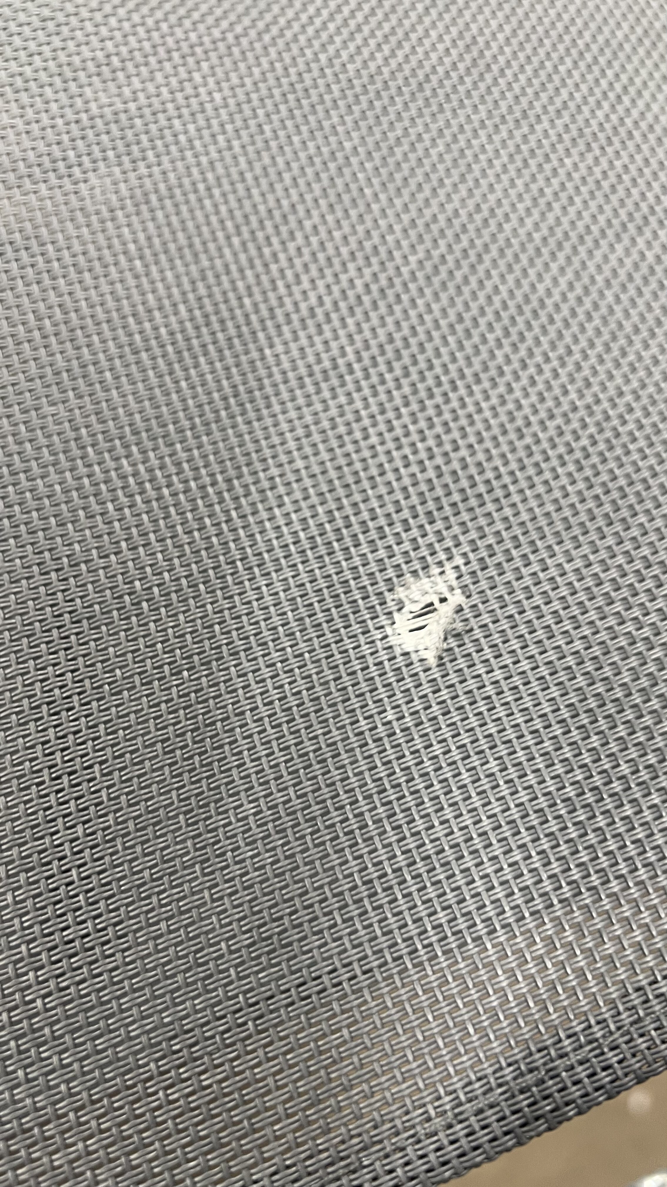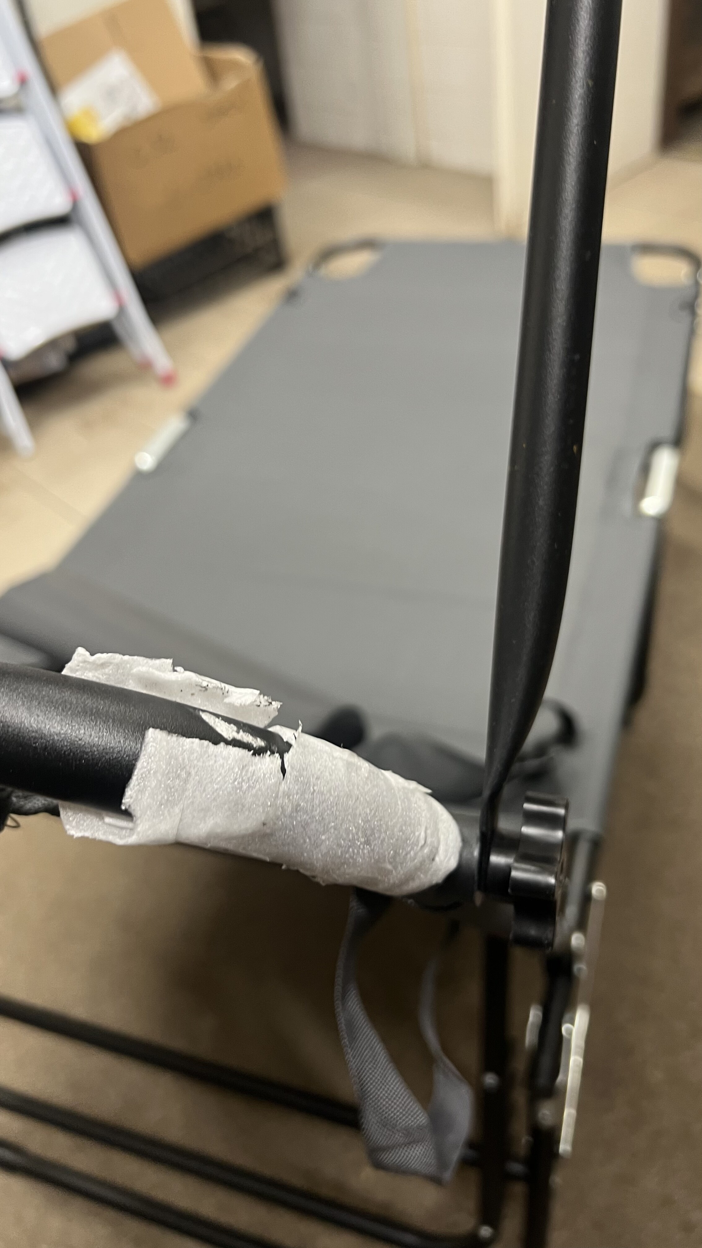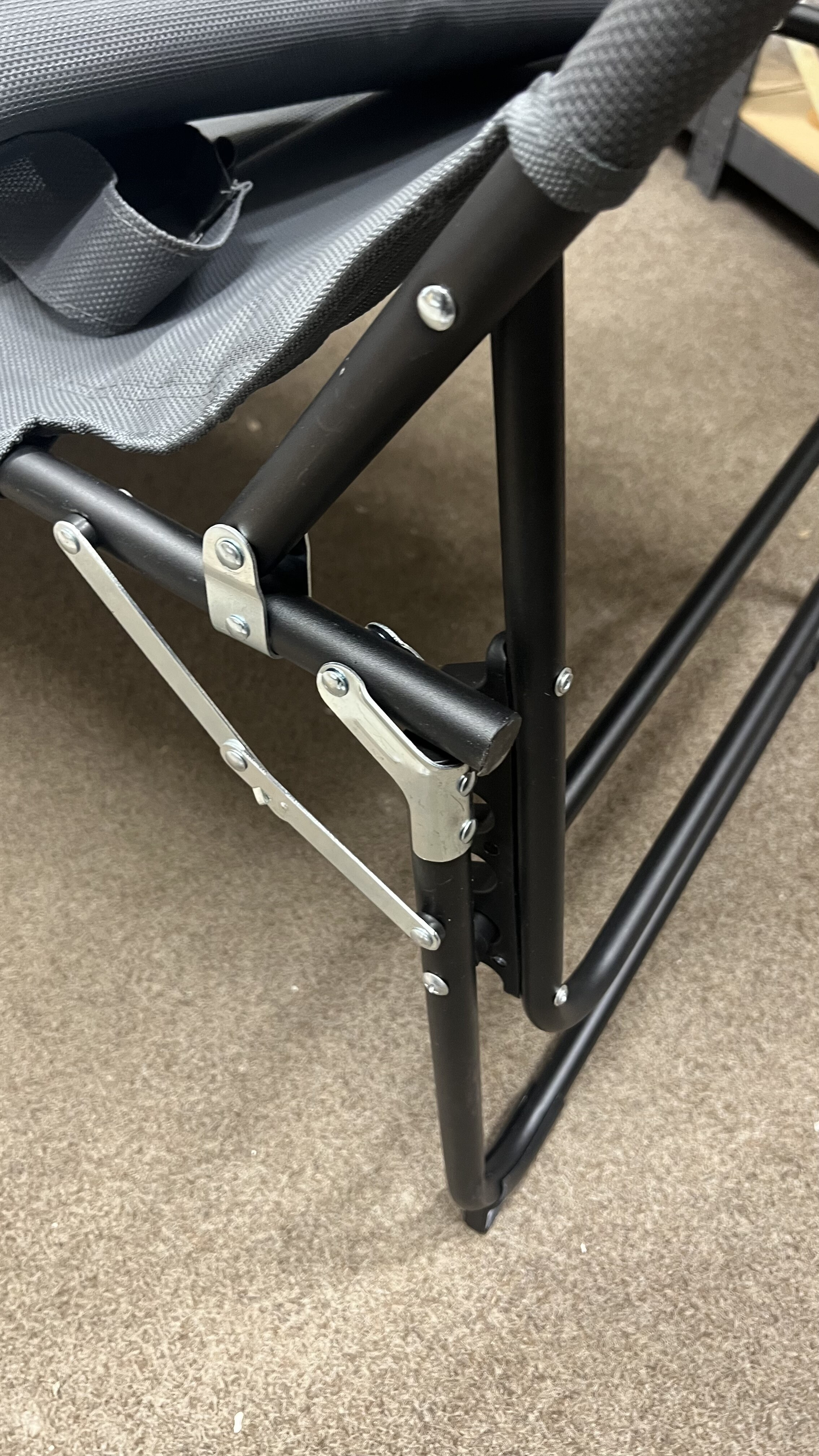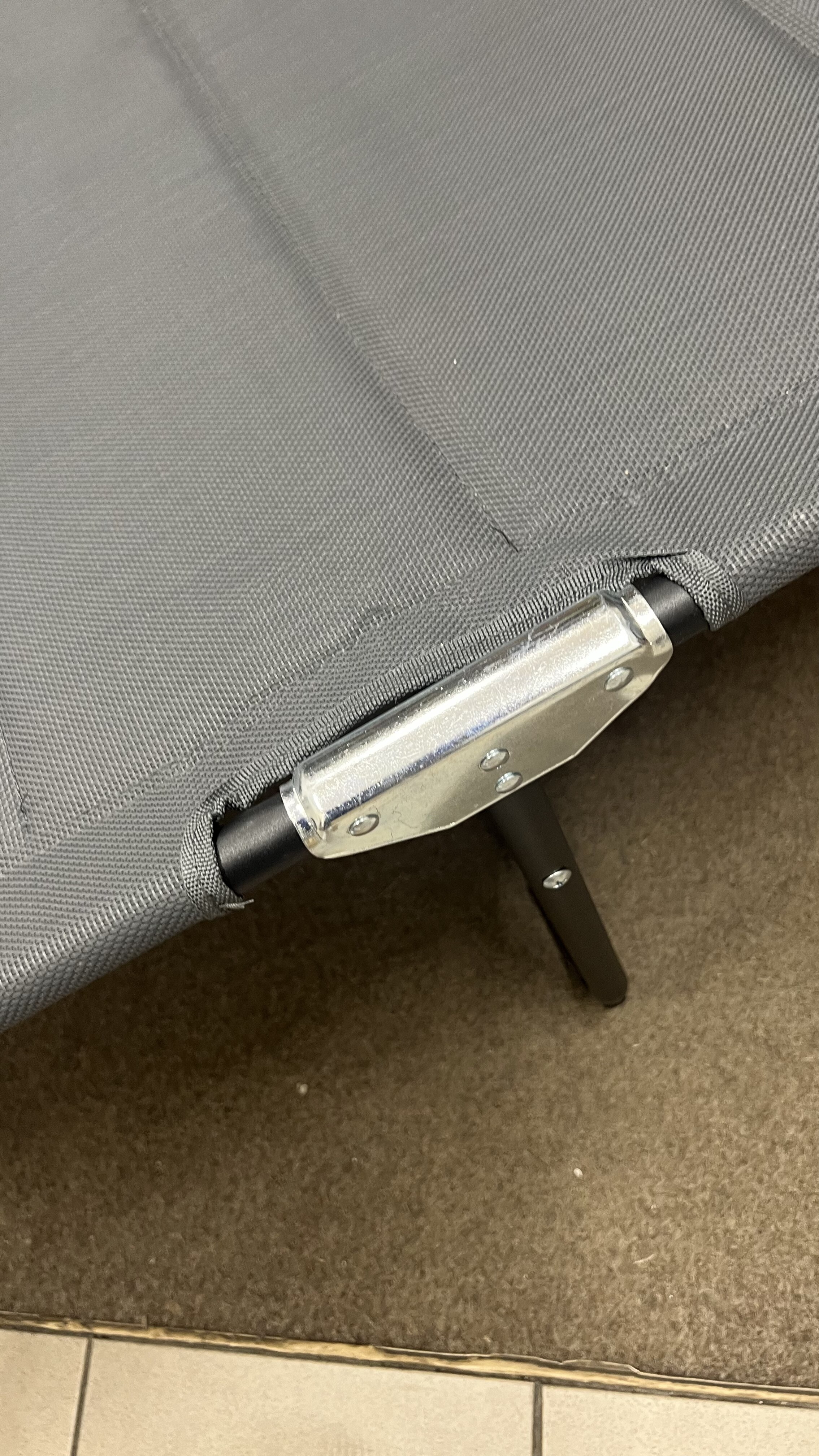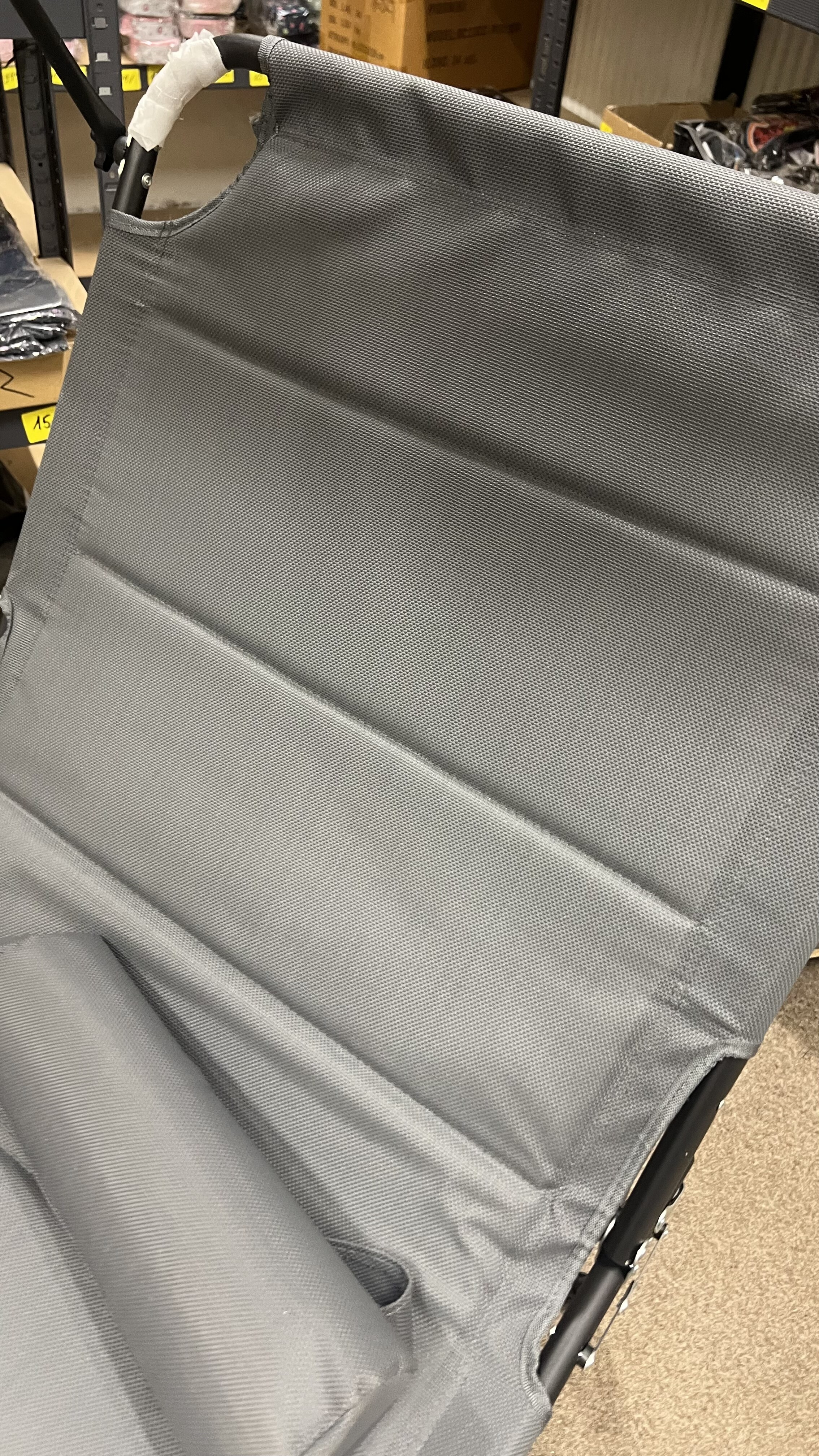 Toto lehátko má drobné nedostatky – na rámu se místy odlupuje barva, konstrukce je místy podřená a ve stříšce je menší díra. Na jeho funkčnost ani pohodlí to však nemá vliv.