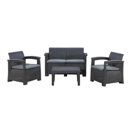 Stabilní konstrukce s opletem z kvalitního umělého ratanu v hnědé barvě. Pohodlné odnímatelné polštářky o tloušťce 4 cm poskytují potřebný komfort během sezení.