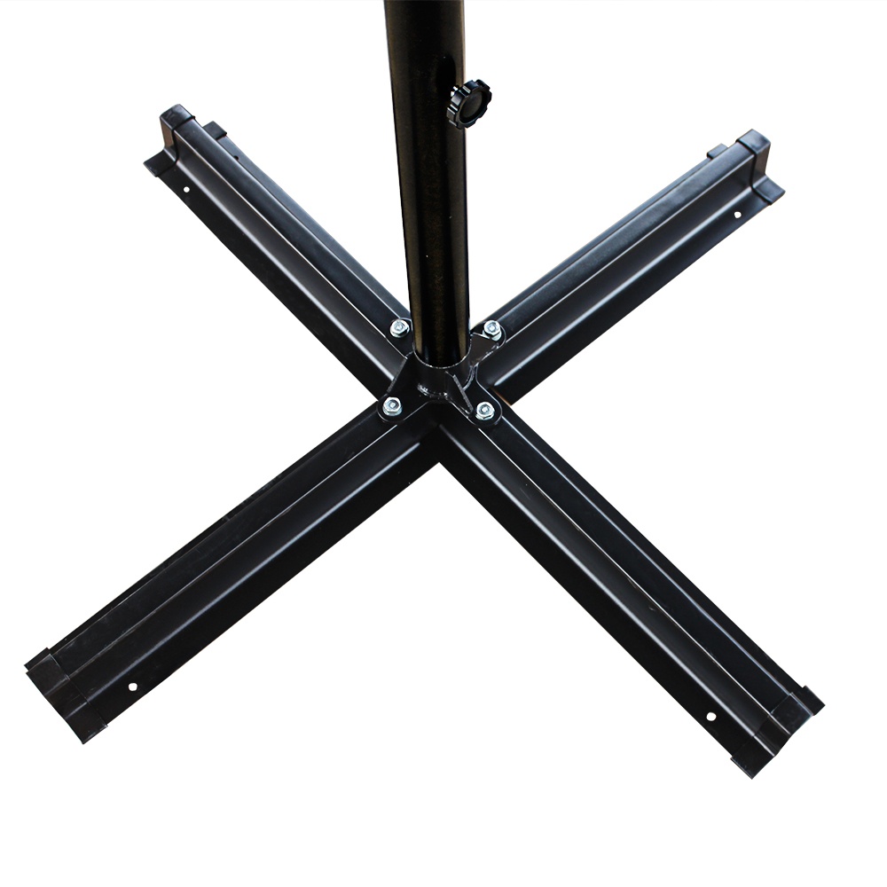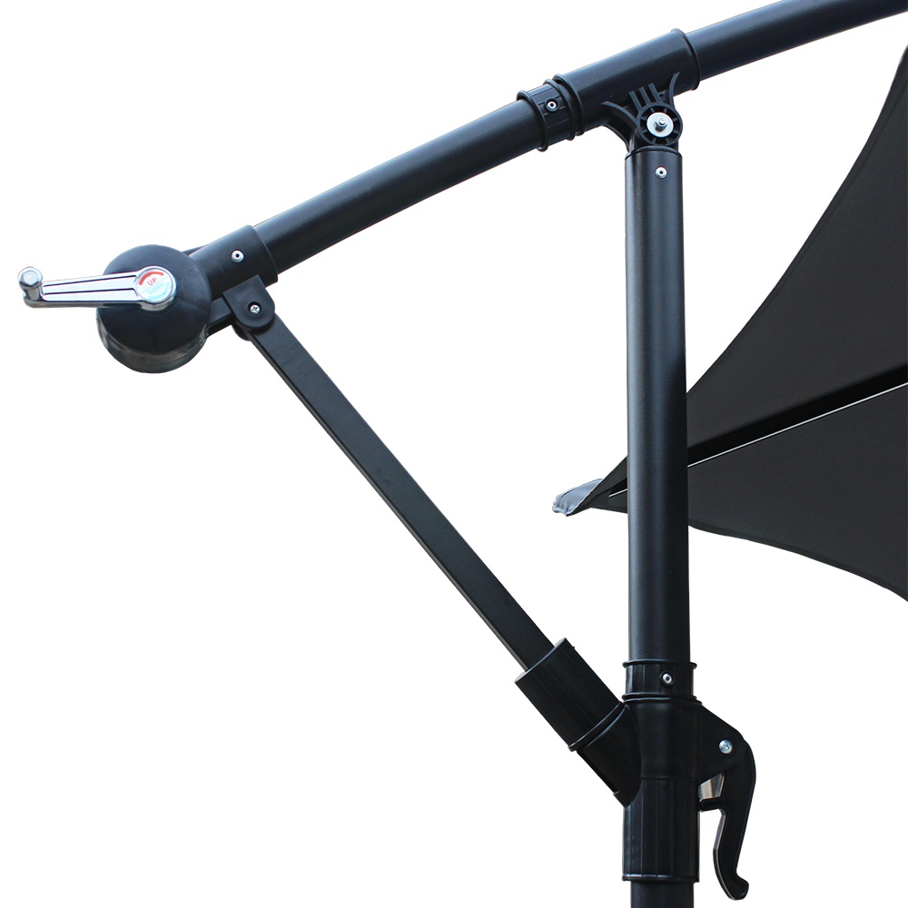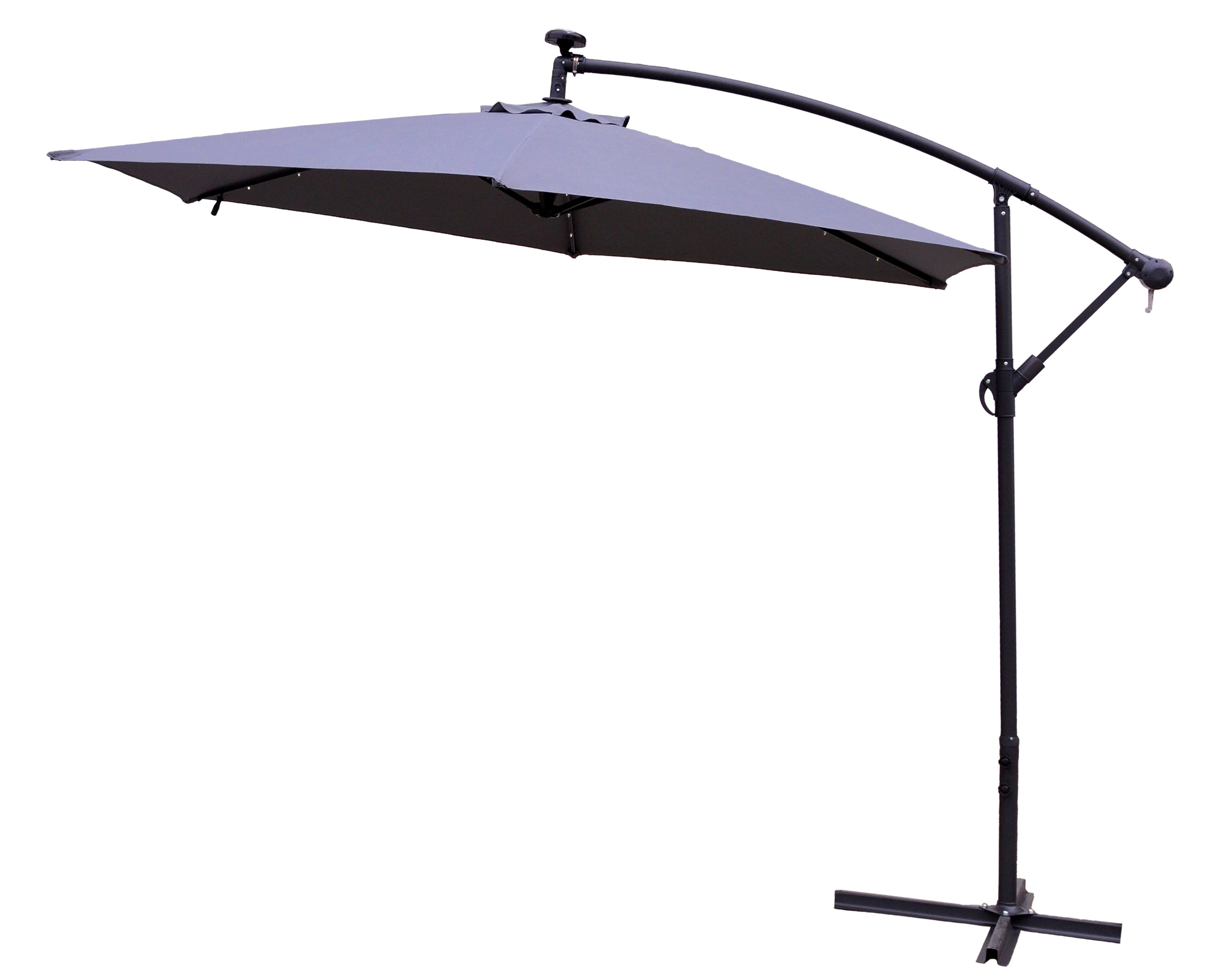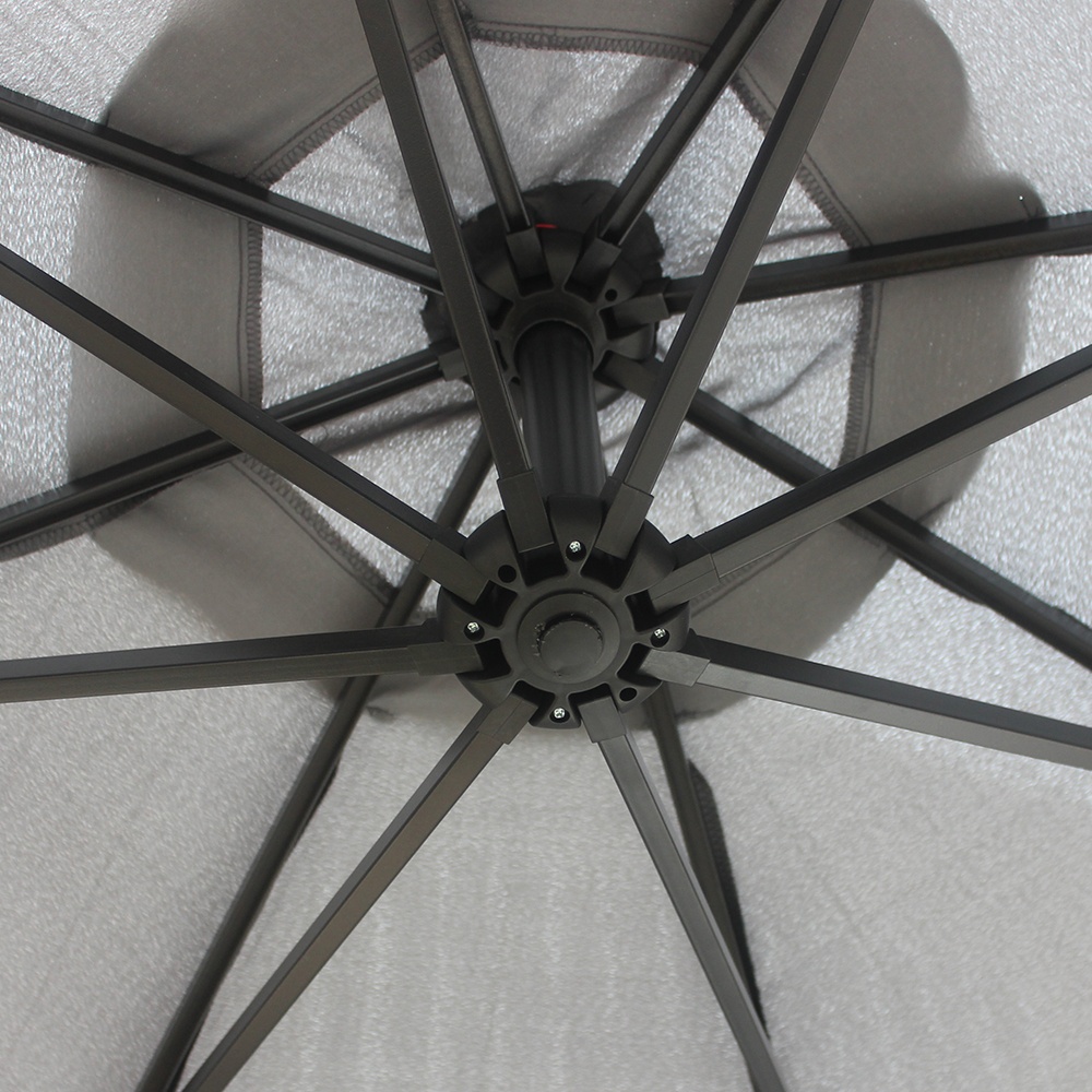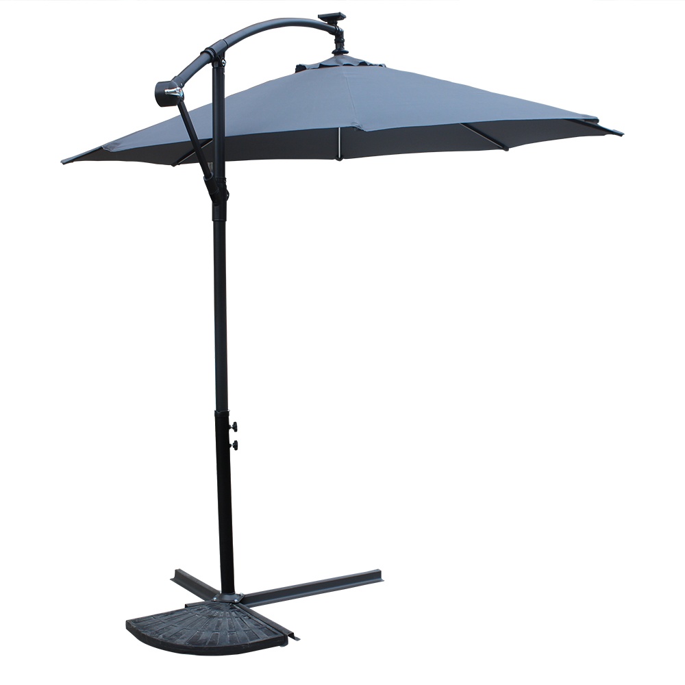 Praktický zahradní konzolový slunečník s LED podsvícením, vyrobený z odolného polyesteru, jehož noha je umístěna mimo stíněnou plochu.