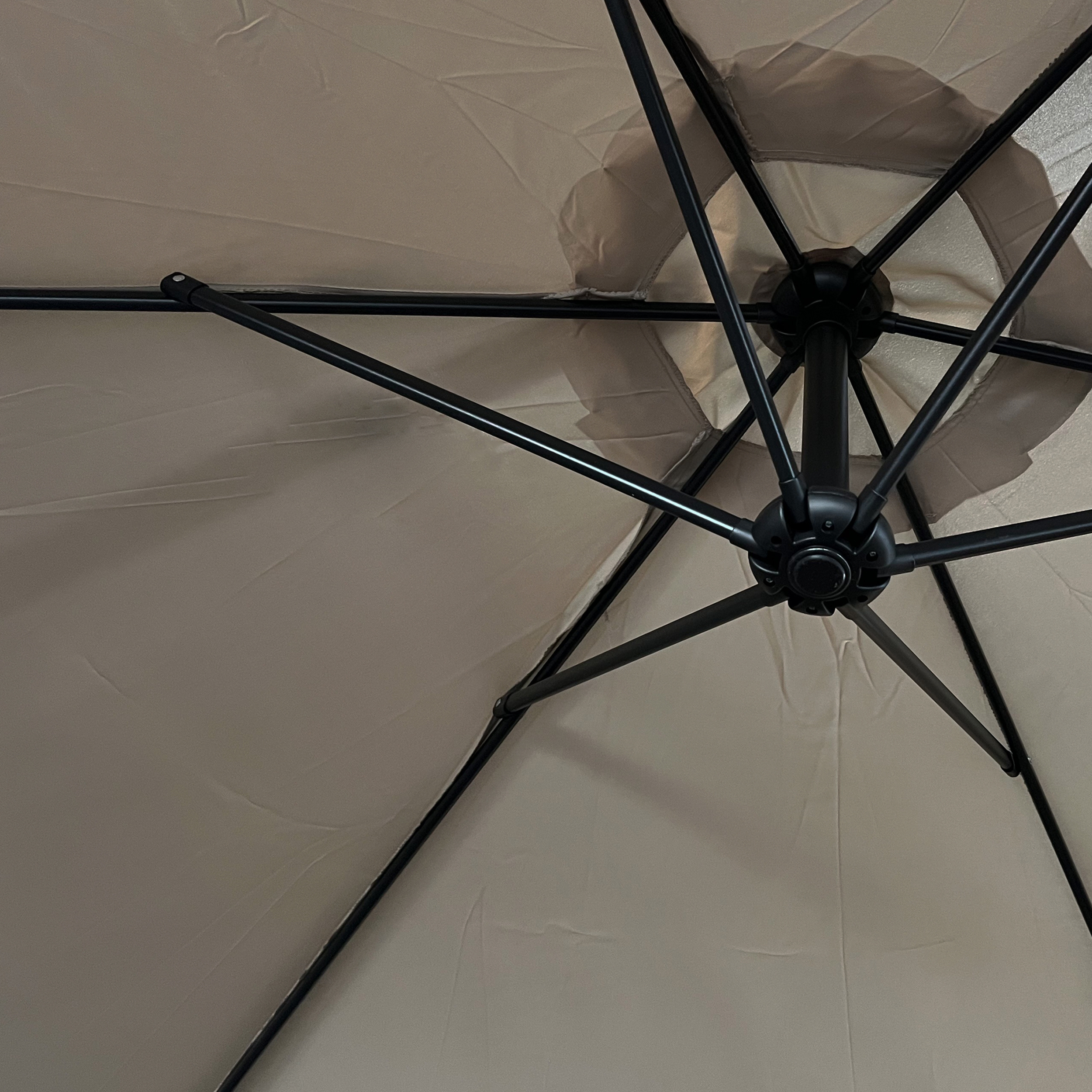 Zahradní slunečník vyrobený z odolného polyesteru, jehož noha je umístěna mimo stíněnou plochu.