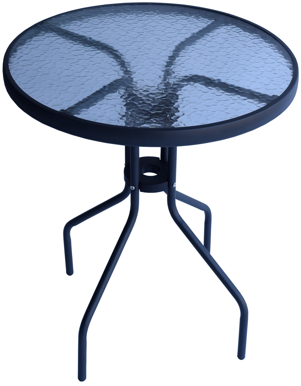 Zahradní stůl s pevným kovovým rámem a vroubkovanou skleněnou deskou v moderním designu, vhodný pro zahrady, terasy, kavárny, altánky, balkóny či pláže.