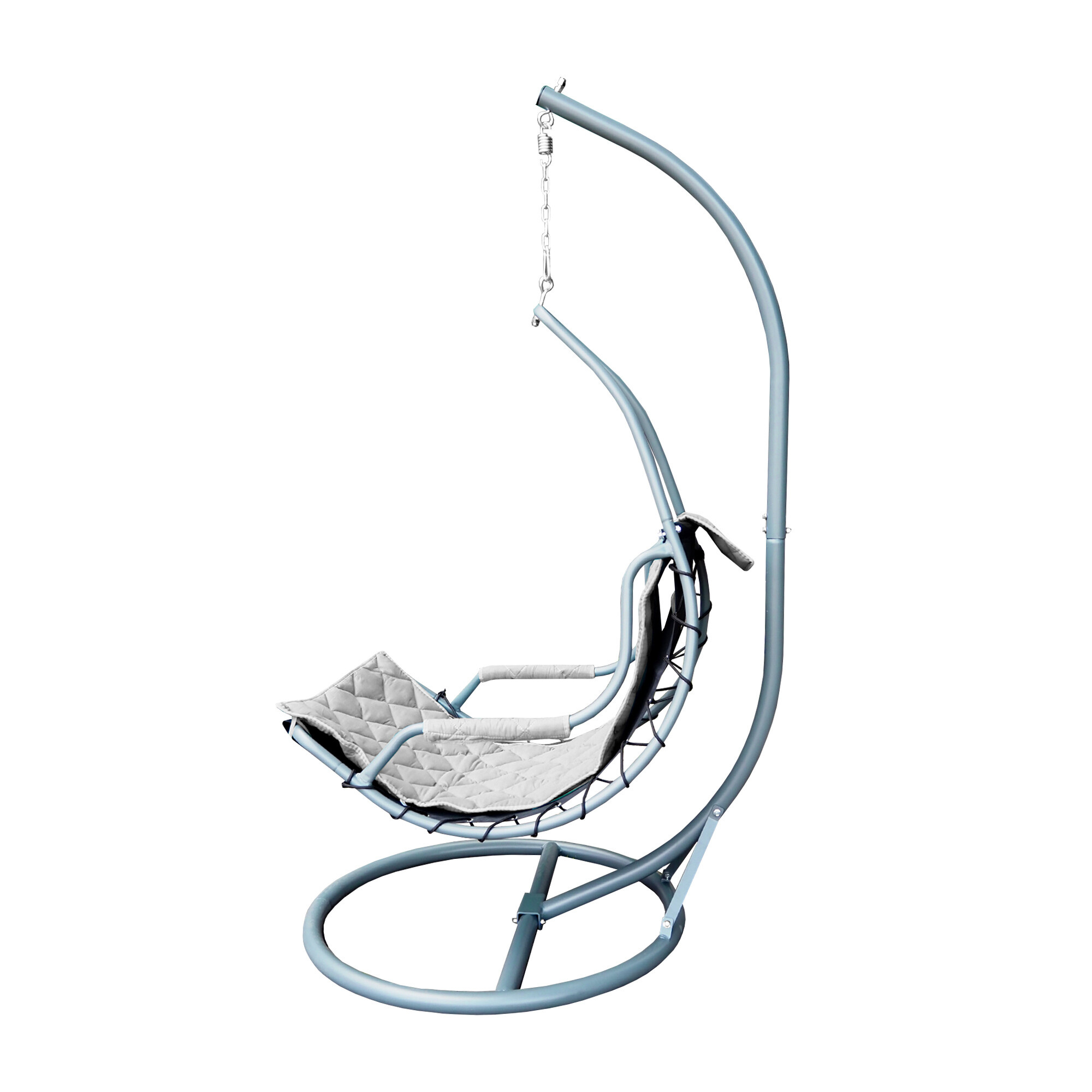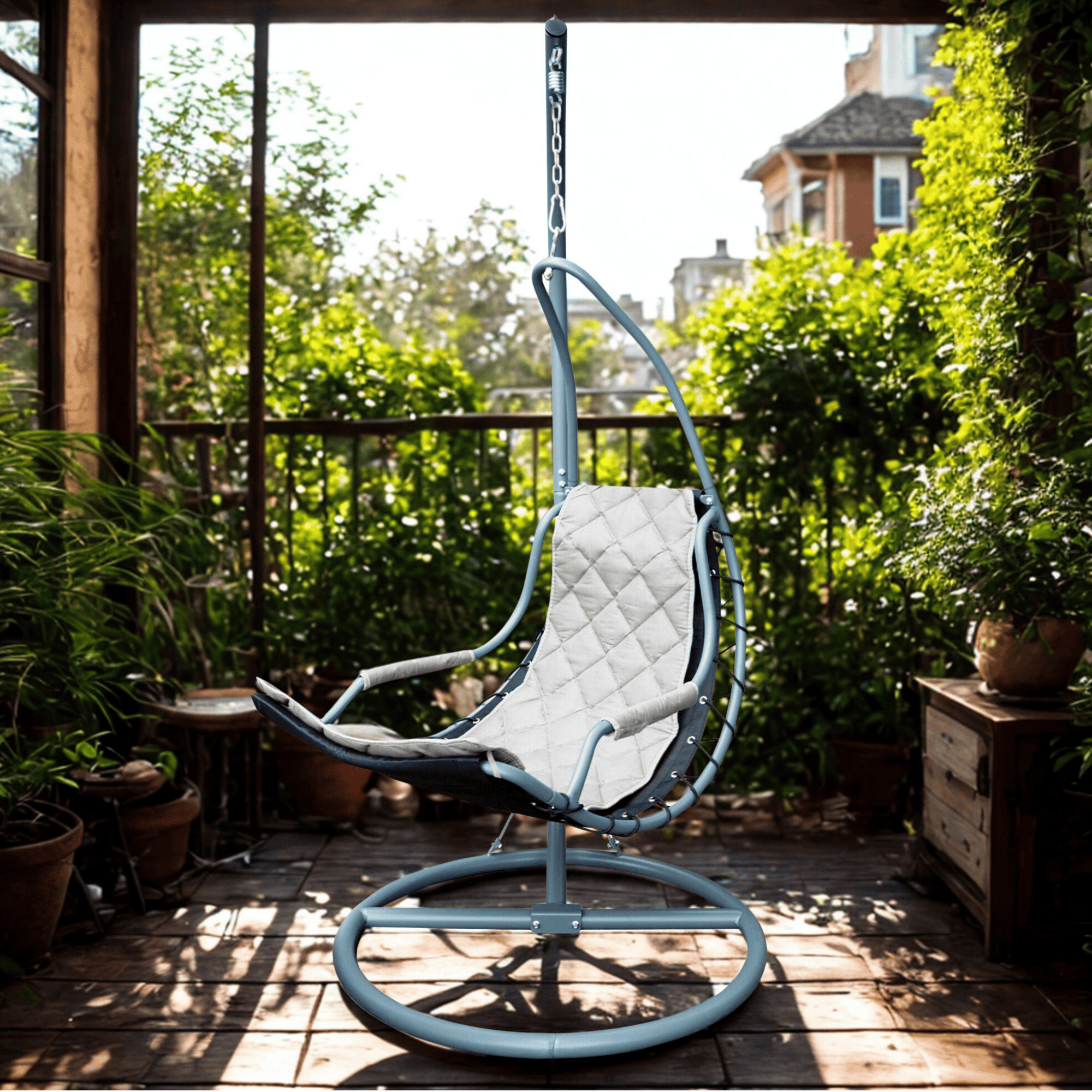 Závěsné křeslo je navrženo s ohledem na moderní estetiku a maximální pohodlí. Jeho šedá barva se snadno hodí do jakéhokoli interiéru nebo exteriéru, ať už ho umístíte na terasu, balkon, do obývacího pokoje nebo na zahradu.