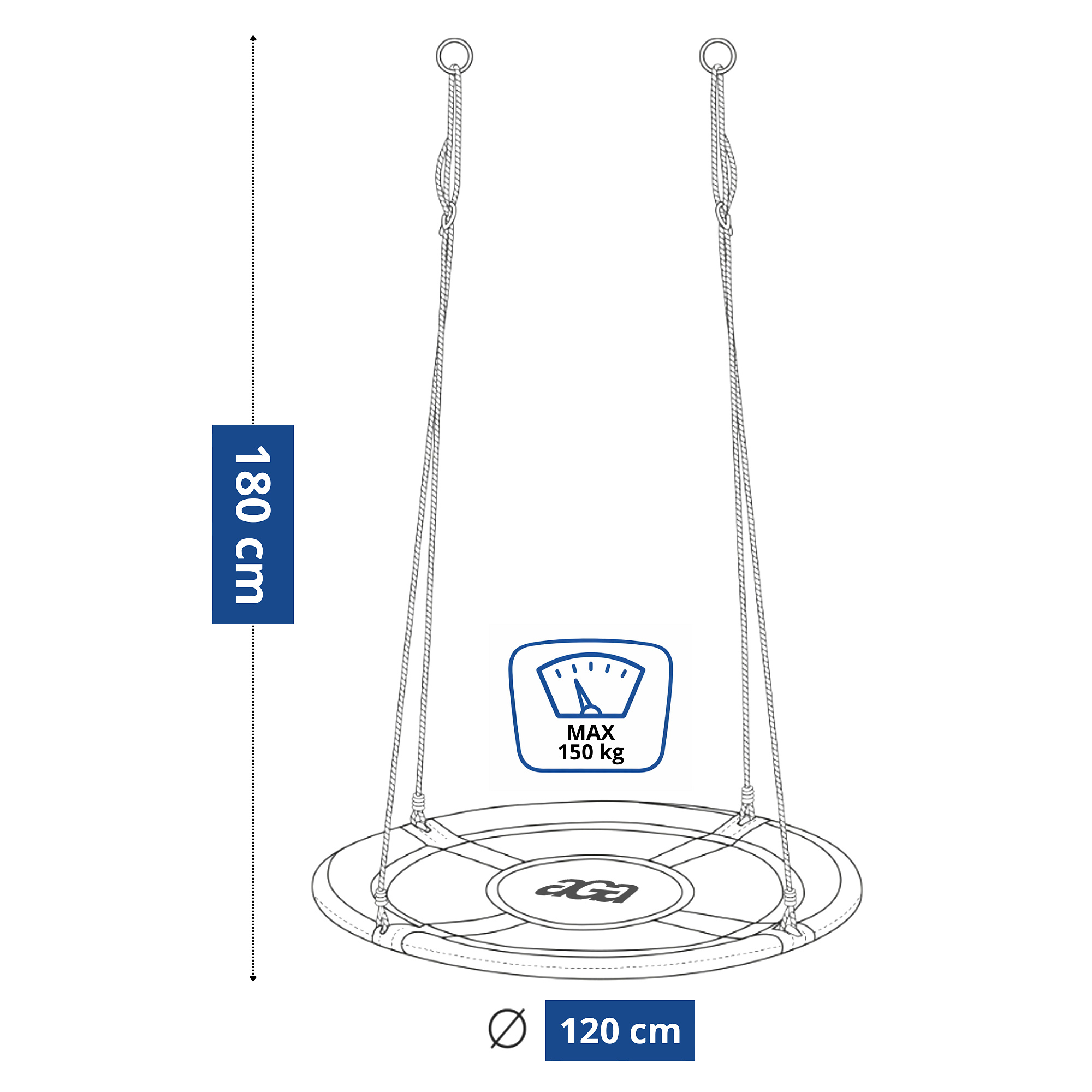 Houpací kruh s průměrem 120 cm je dostatečně velký na to, aby se mohly houpat i dvě děti najednou. Nosnost kruhu je 150 kg.