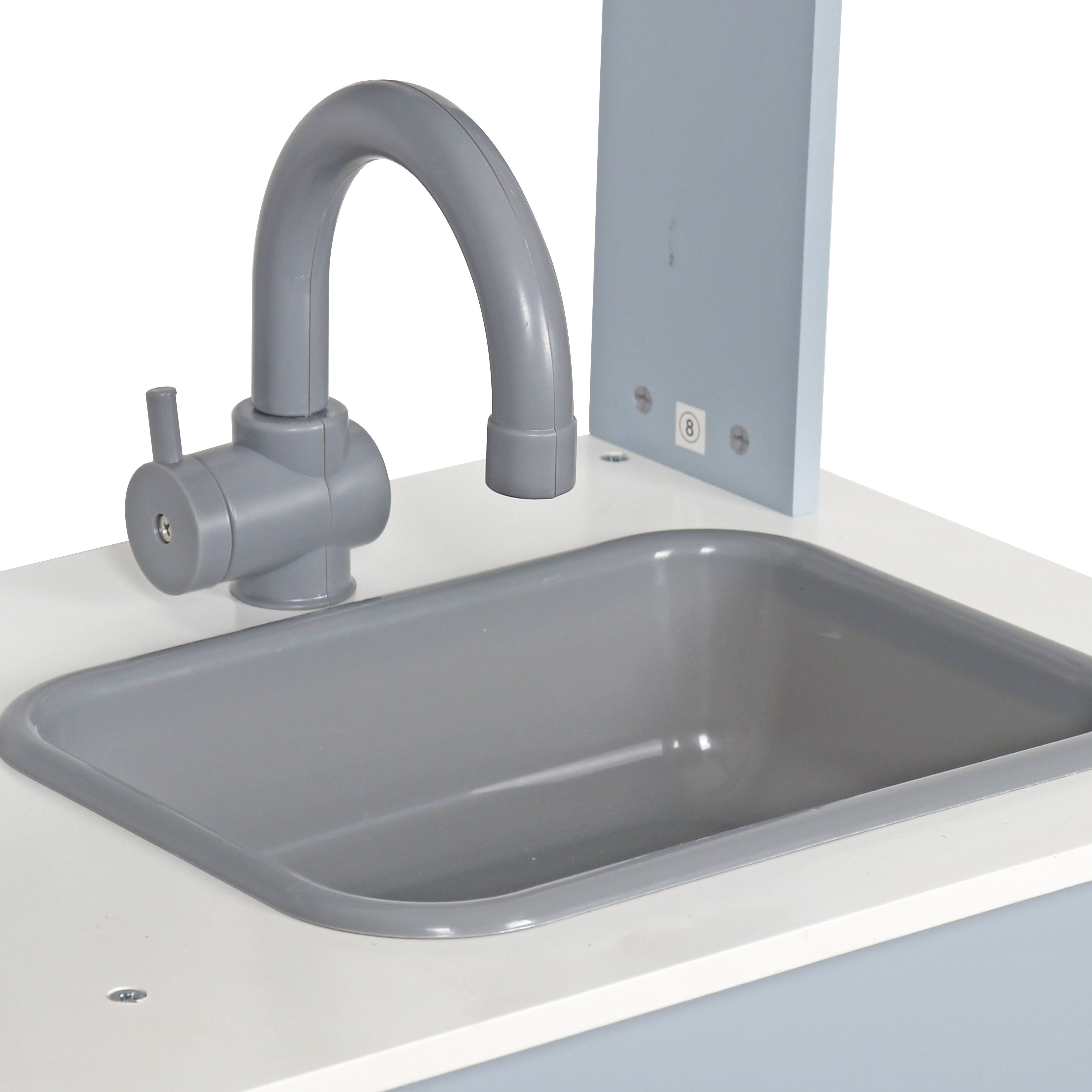 Dřez v kuchyni je vyjímatelný, takže ho dítě může naplnit vodou a po dokončení práce v kuchyni umýt nádobí.