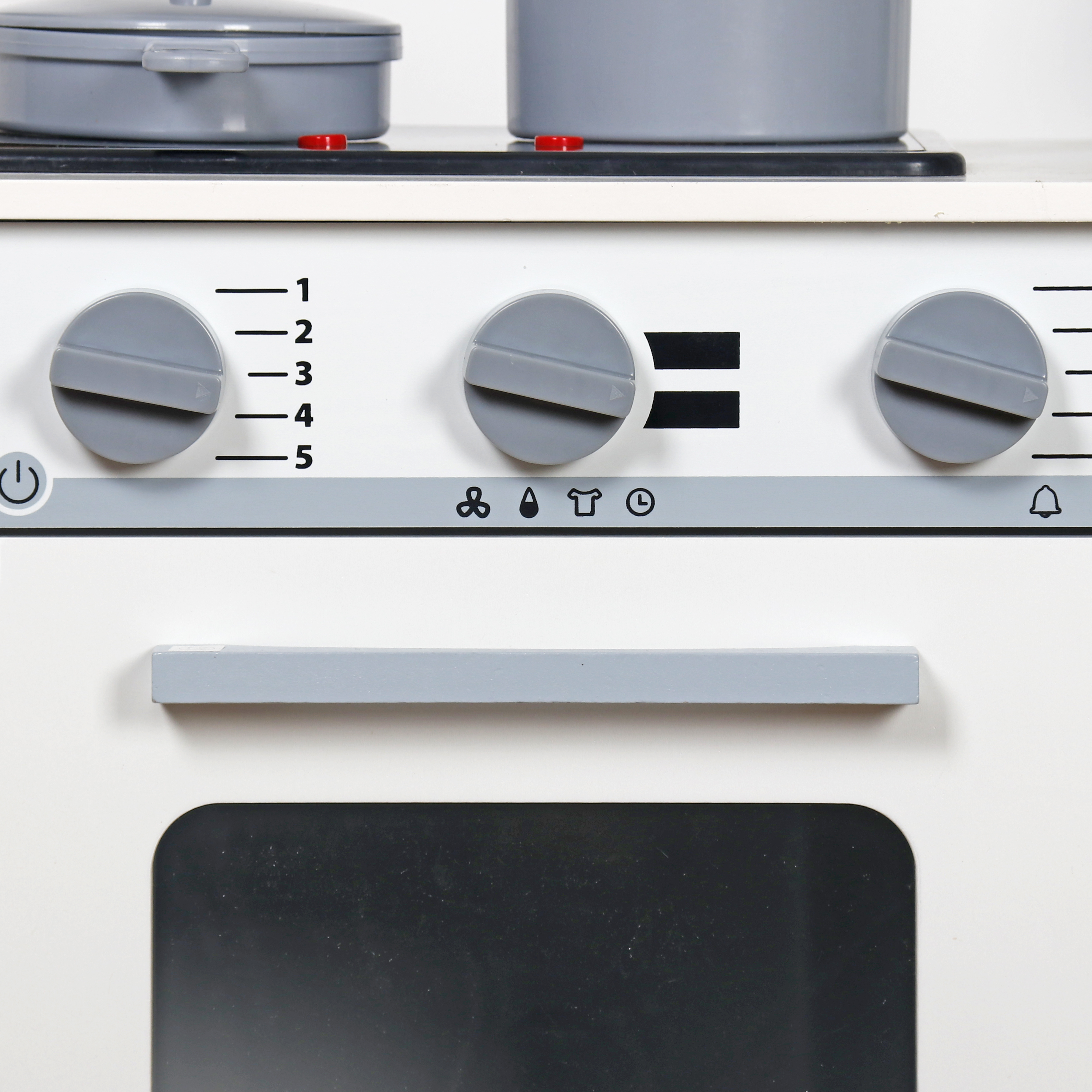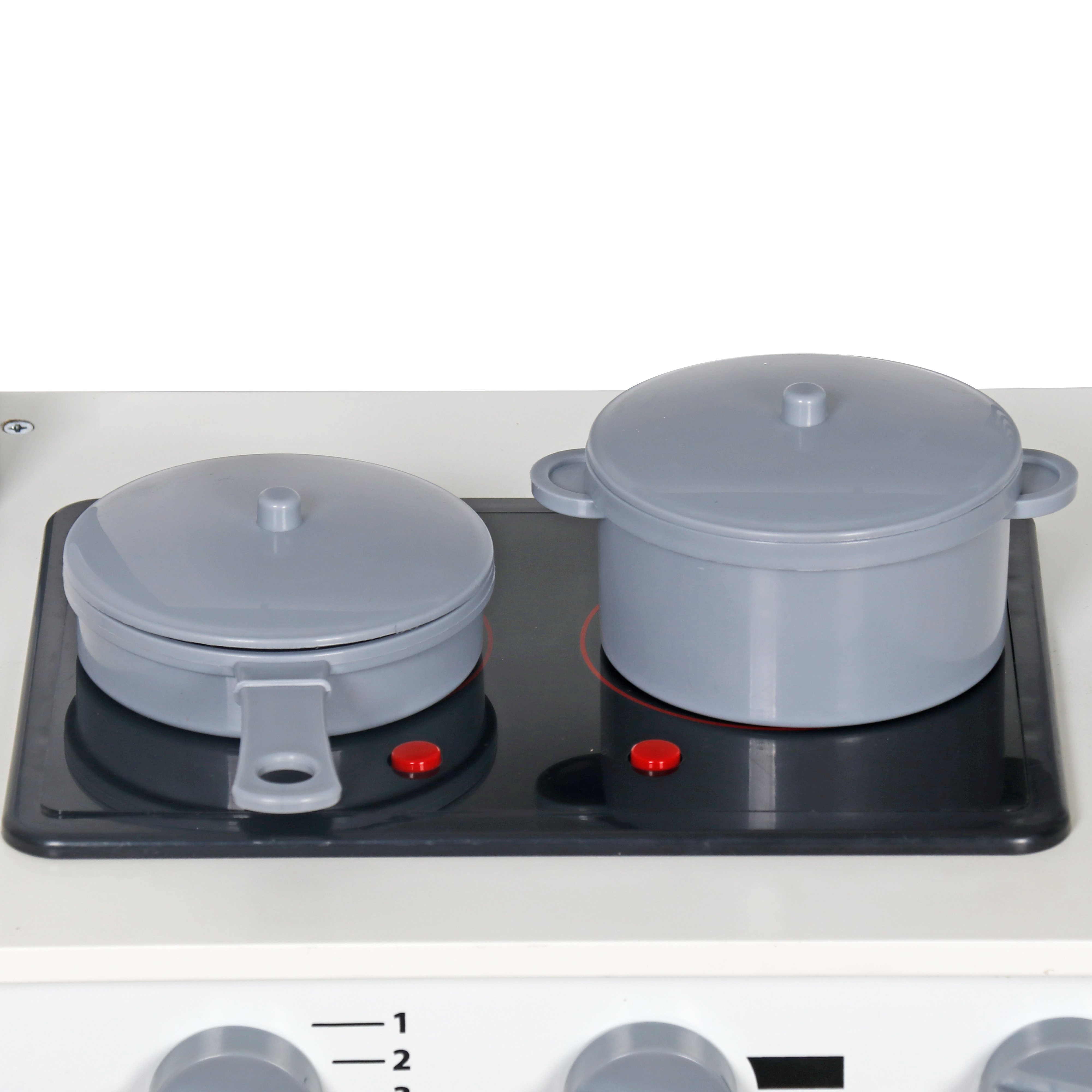 Hořáky na sporáku jsou podsvícené a vydávají zvuk vaření. Když chce dítě snížit nebo zvýšit teplotu na pečící troubě knoflíky vydávají cvakavý zvuky.