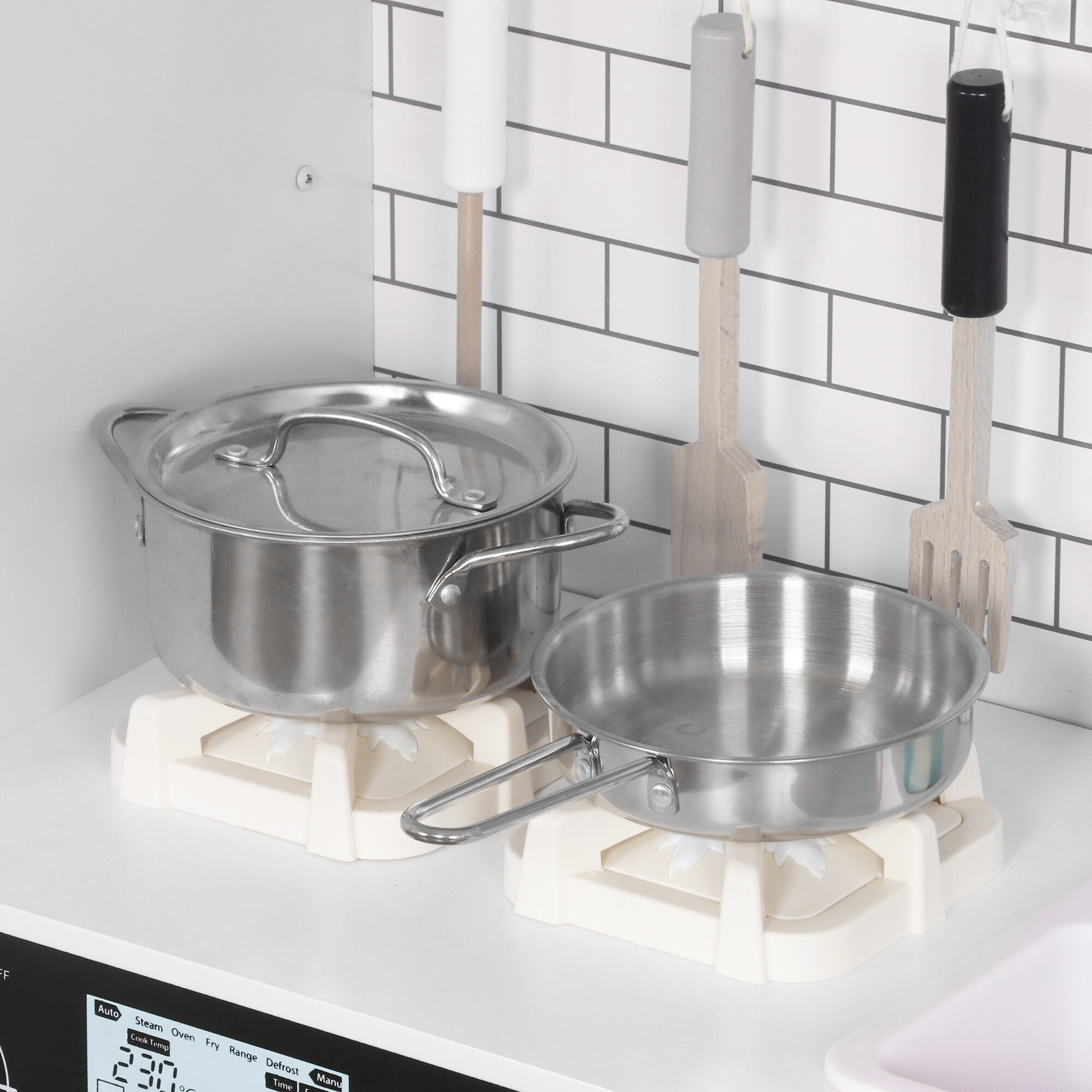 Pro přípravu chutných pokrmů je dětská kuchyňka vybavena nádobím. V kuchyňce nechybí police pro uložení nádobí a háčky pro zavěšení kuchyňského náčiní.