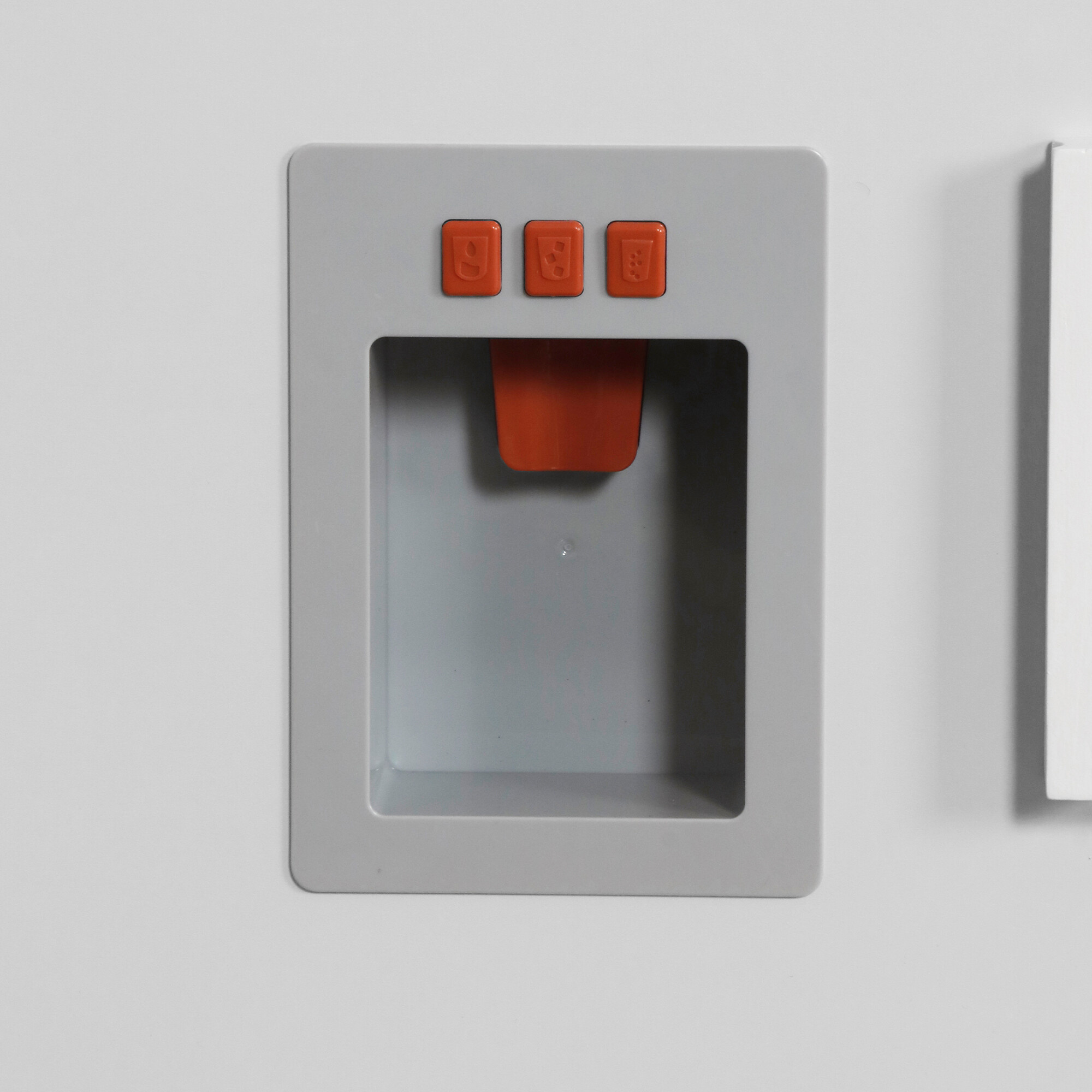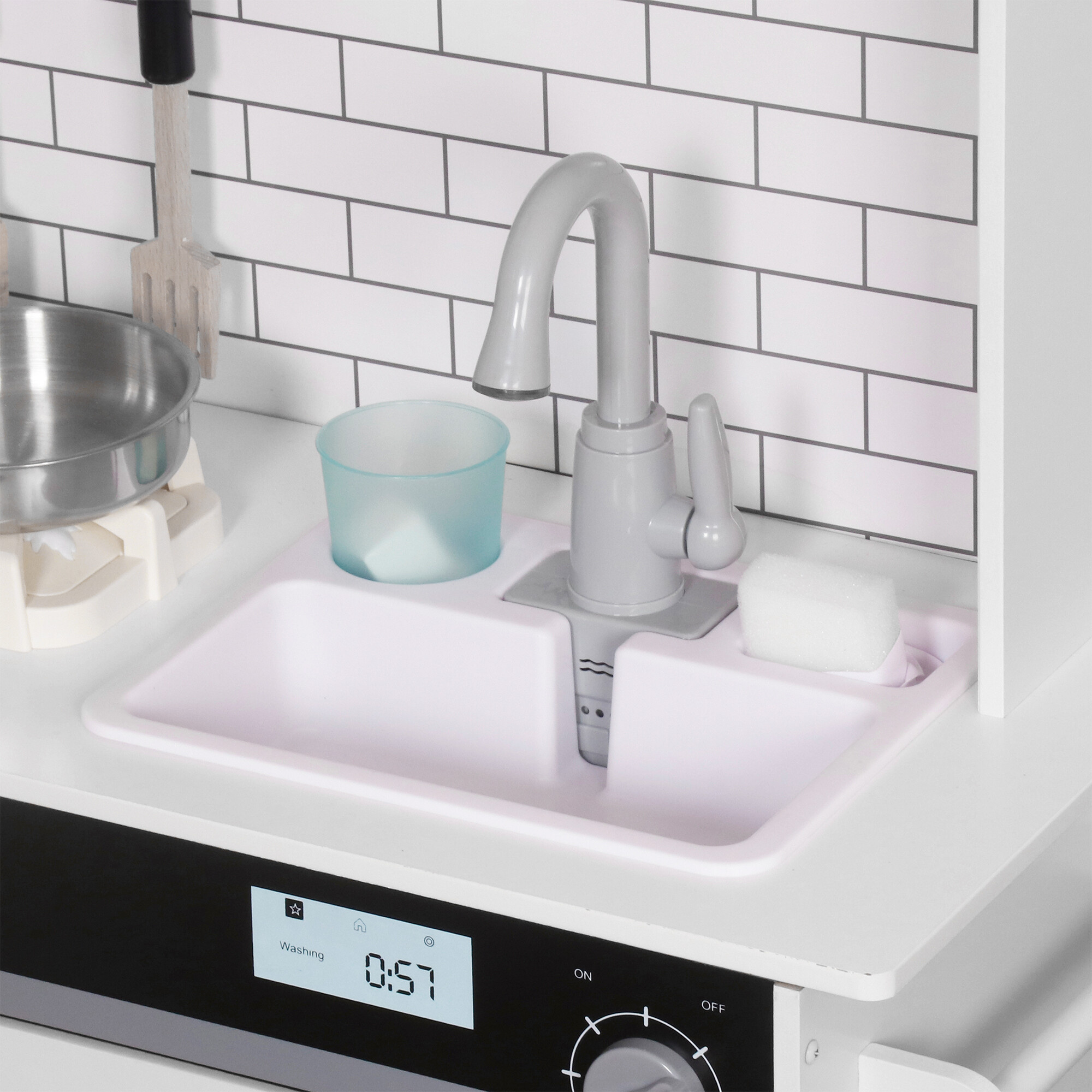 Dřez v kuchyni je vyjímatelný, takže ho dítě může naplnit vodou a po dokončení práce v kuchyni umýt nádobí.
