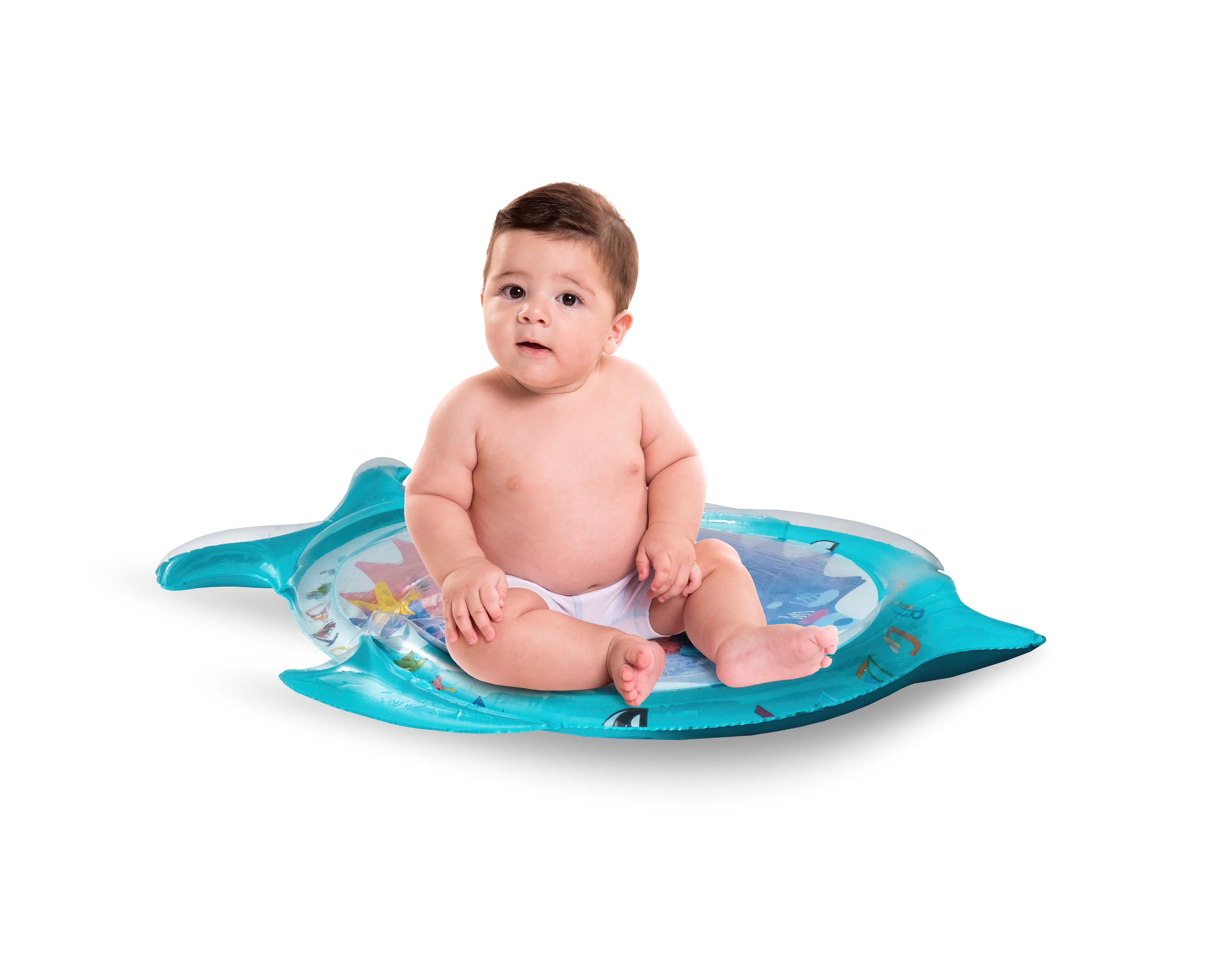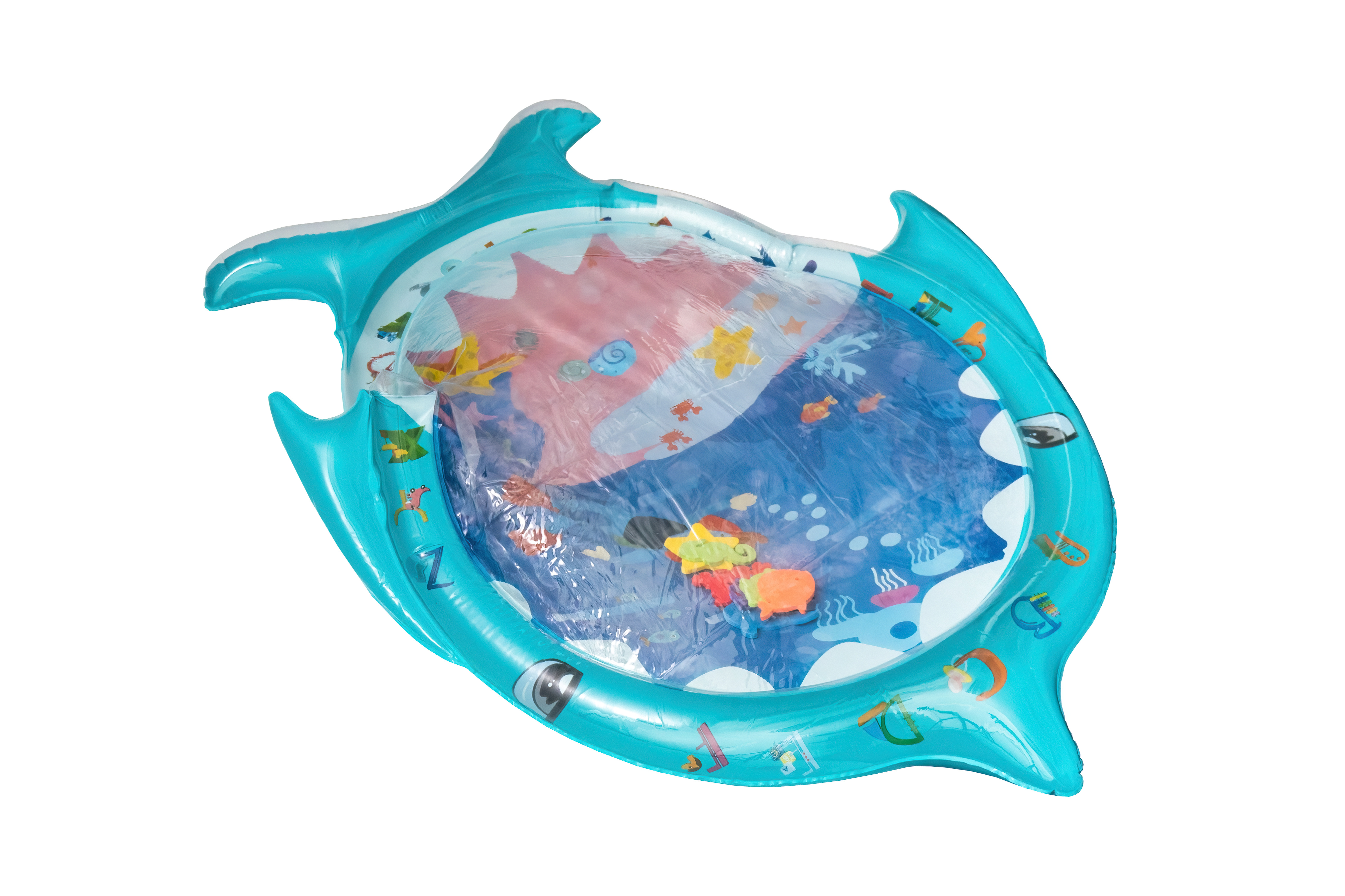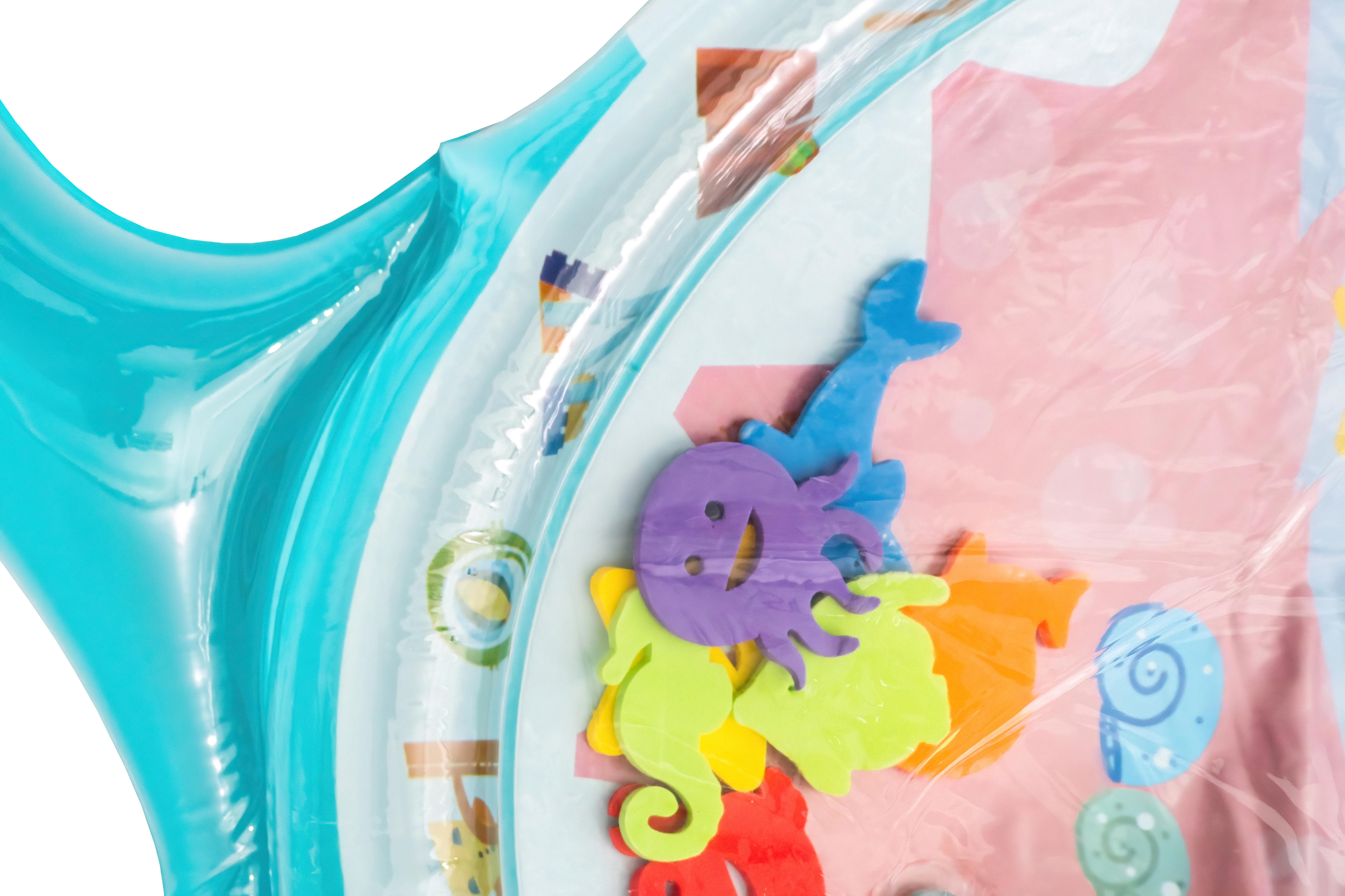 Stačí nafoukat okraj podložky a střed naplnit vodou popřípadě je možnost ji nafouknout. Díky vodě uvnitř se začnou pohybovat prvky ve tvaru mořských živočichů, které dítě povzbuzují ke hře.