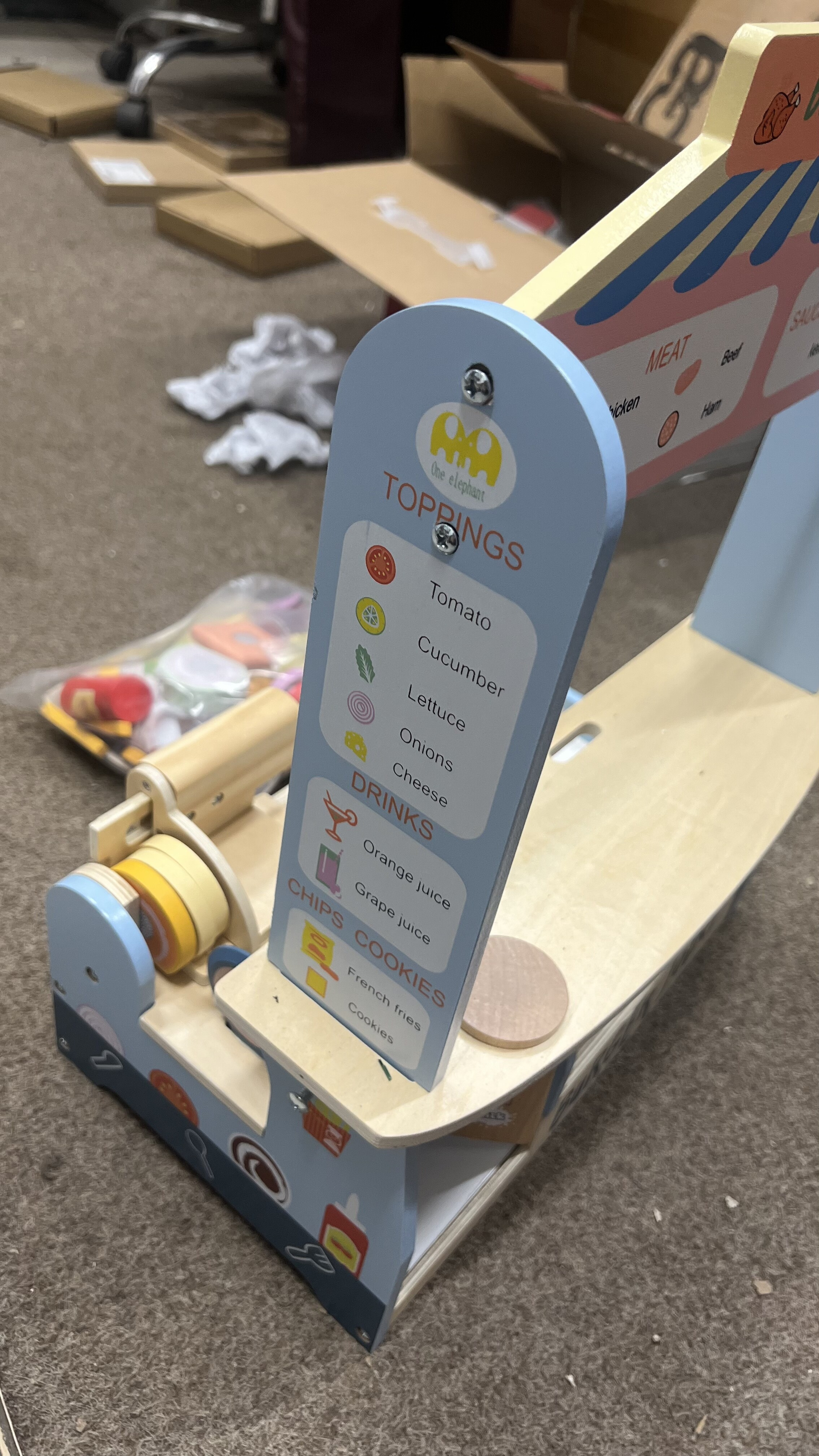 - Sestava dětského prodejního stánku zahrnuje stánek, látkovou markýzu a tři funkční šuplíky