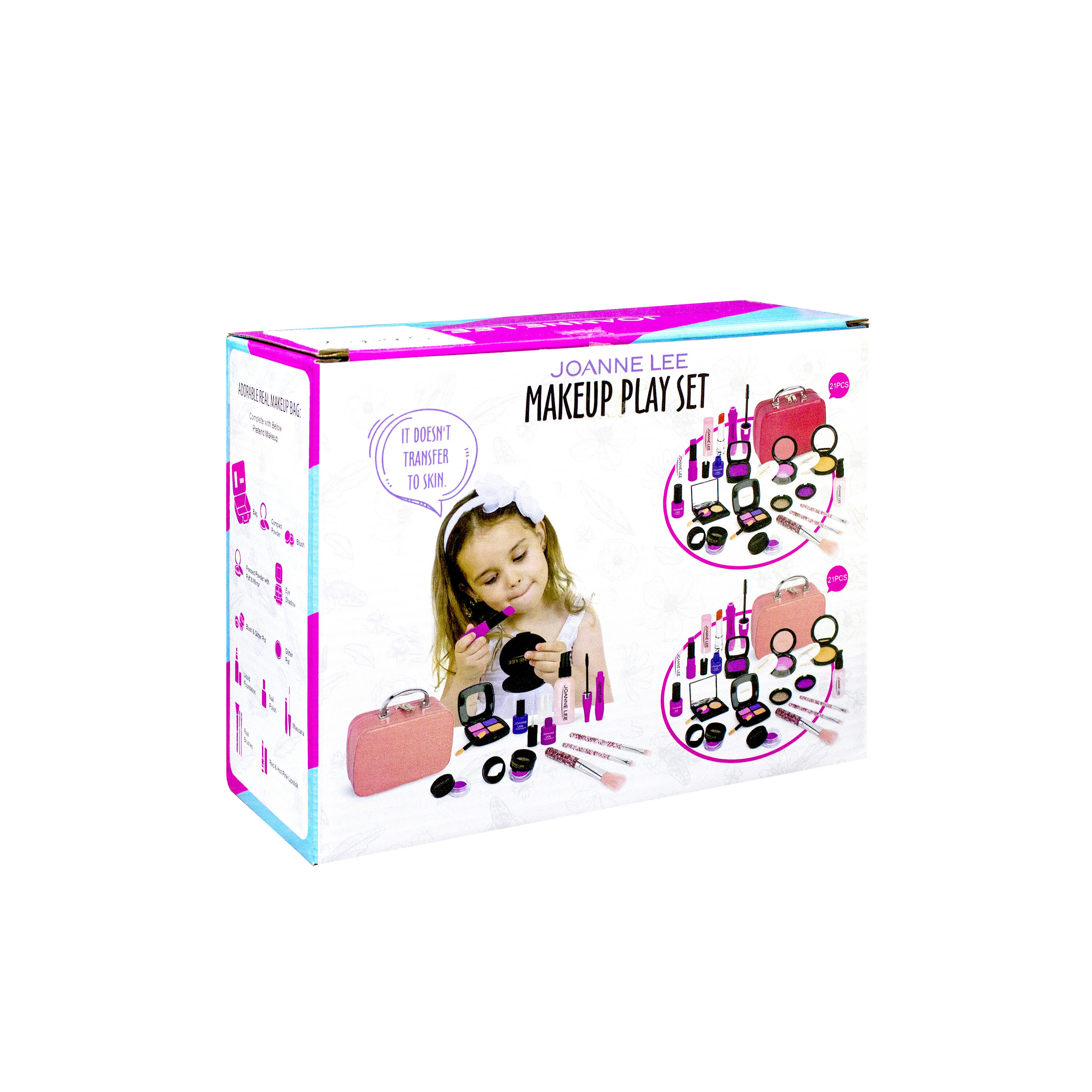 Praktický kosmetický kufřík pro děti, uzavíratelný na zip obsahuje parfém, 2x rtěnka, řasenka, 2x lak na nehty, 2x oční stíny, 2x lisovaný pudr, 3x štětec, 5x lesk a 2x pudřenka.