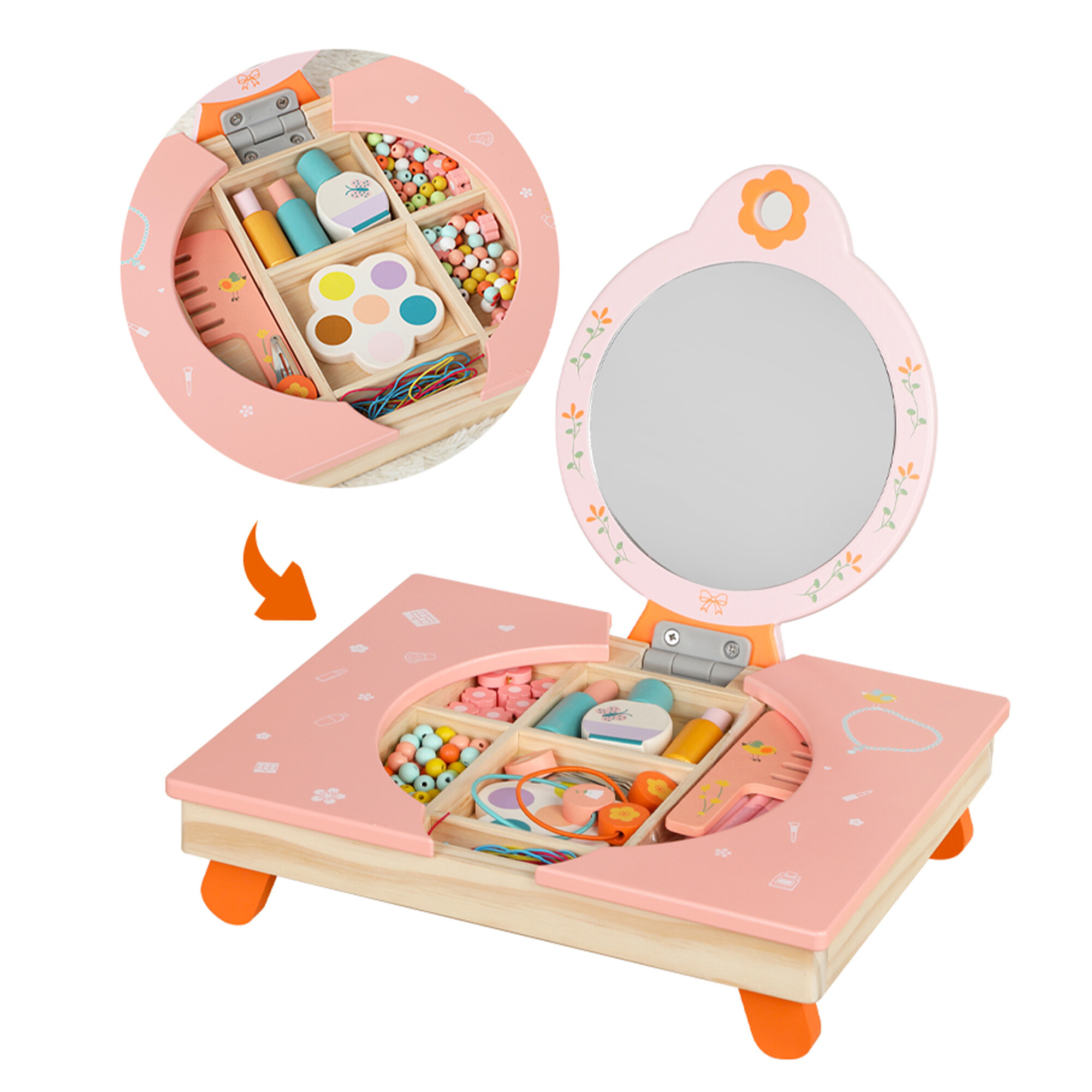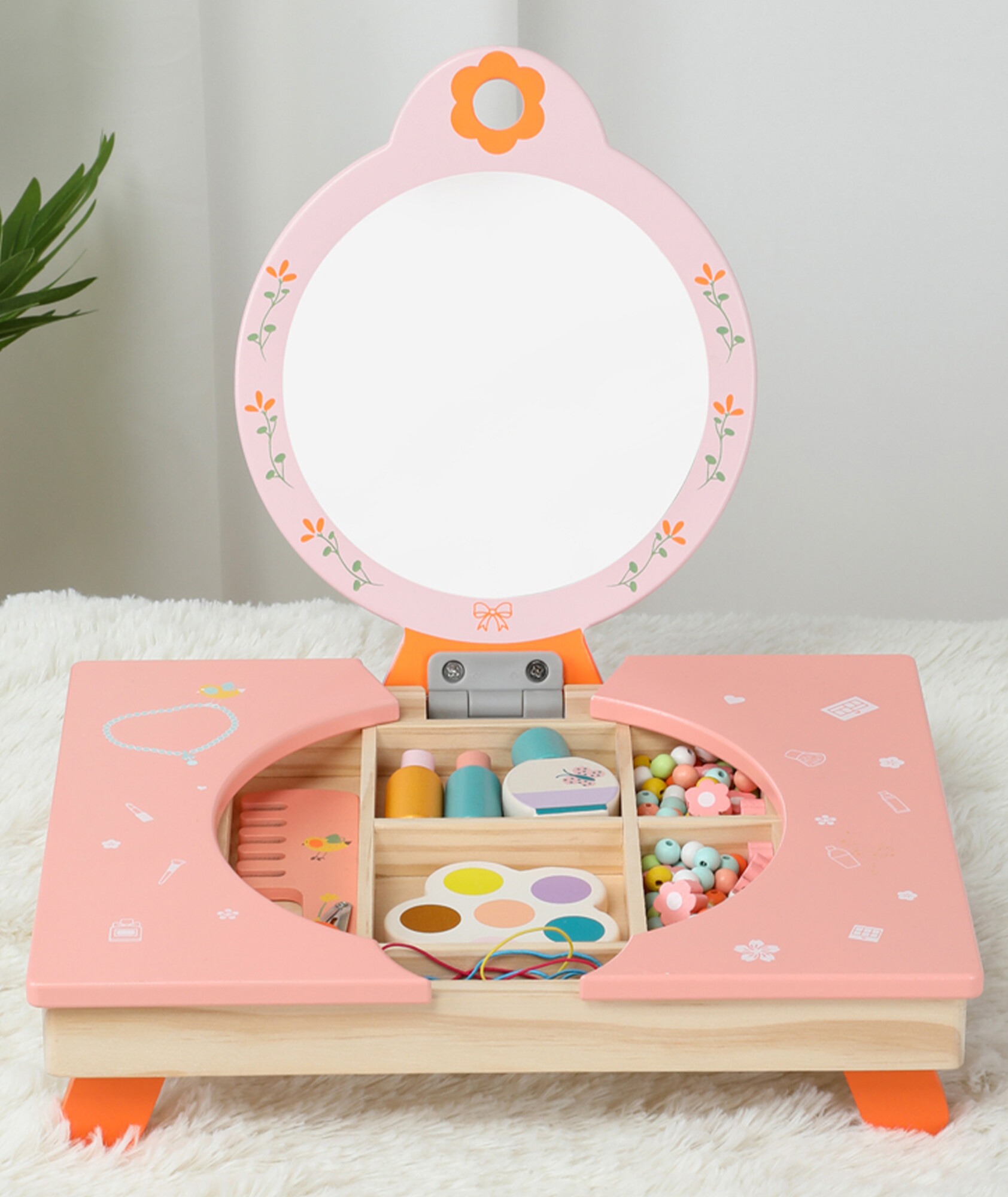 Být na chvíli jako maminka je snem snad každé malé holčičky. Pořízením dětského toaletního stolku Aga4Kids jí její sen můžete splnit. Dřevěný toaletní stolek je vybaven zrcadlem, které má zaoblené hrany pro maximální bezpečnost, nechybí ani prostor na mnoho princeznovských pokladů.