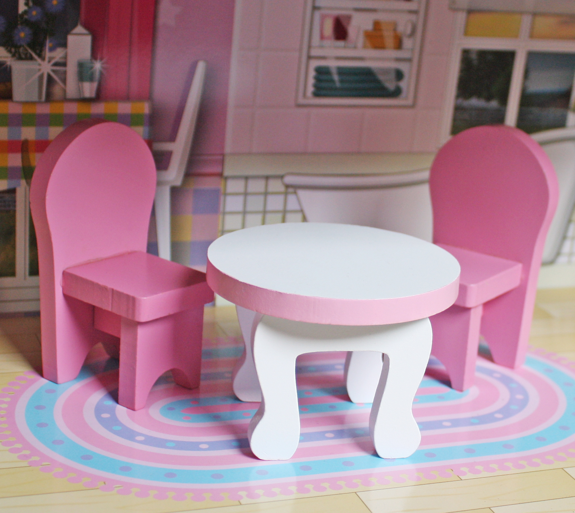 V přízemí domečku se nachází koupelna a kuchyň. V prvním patře je velký obývací pokoj se dvěma židlemi, stolem a menší místnost. V podkroví najdete ložnici pro panenku se vstupem na terasu.