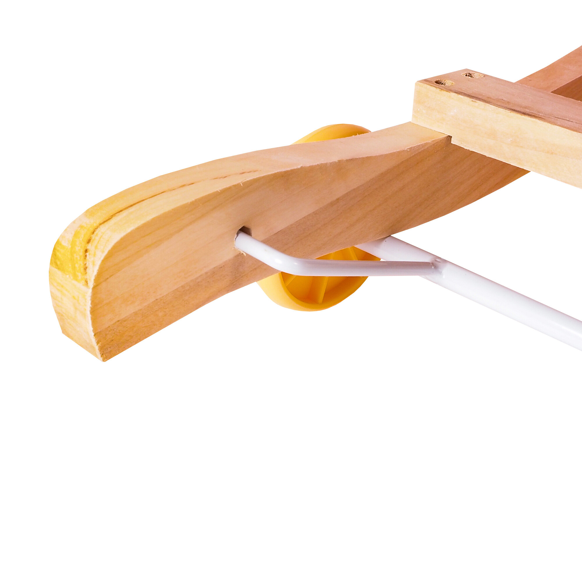 Pevné dřevěné lišty a rukojeti pomáhají dítěti udržet rovnováhu. Překlopením jednoduchého mechanismu na lištách vysunete kolečka, čímž ve vteřině změníte houpací hračku v jezdícího beruška.