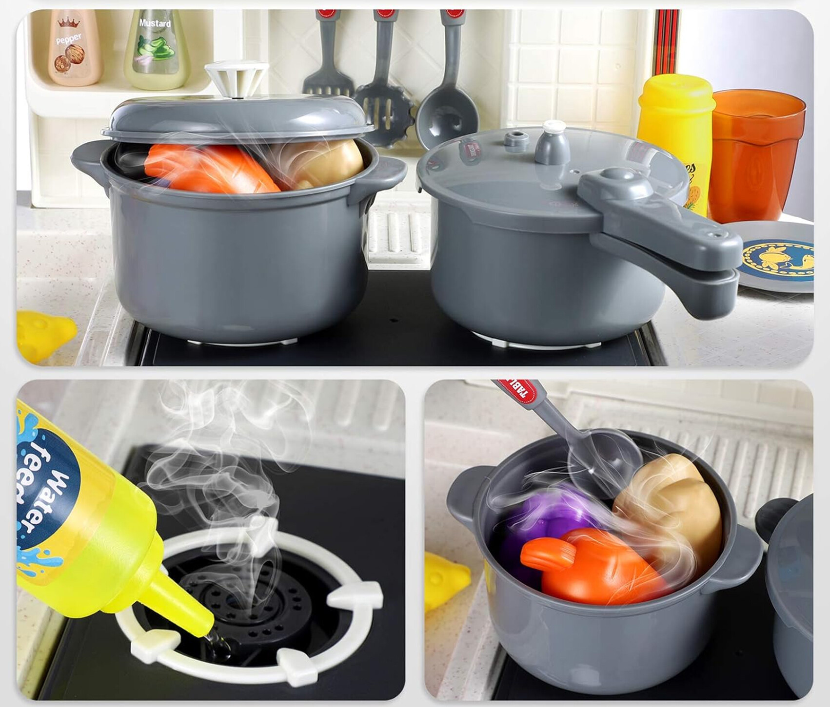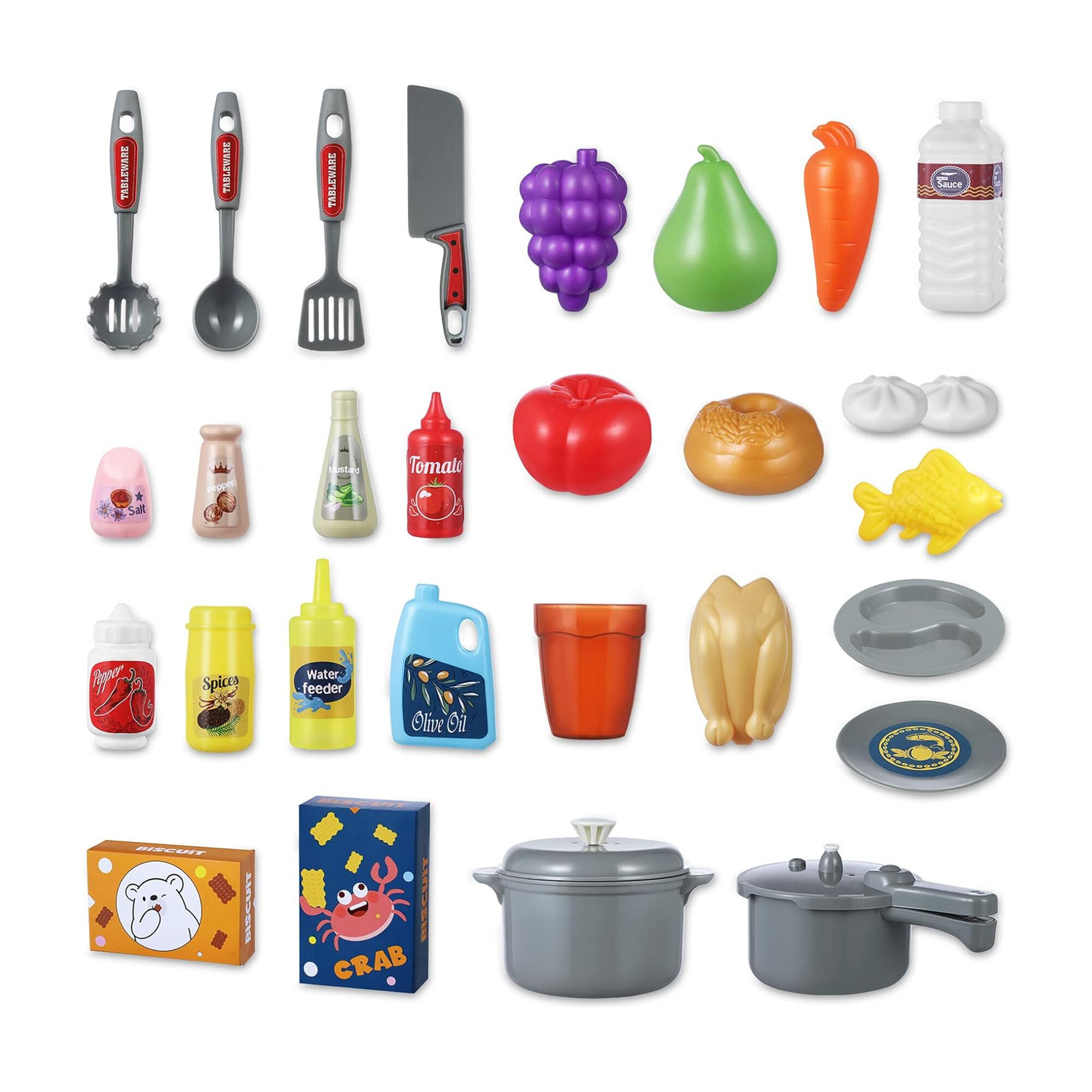 - Obsahuje spoustu různého příslušenství jako jsou hrnec, pánvička, pokličky, talíře, náčiní, jídlo aj.