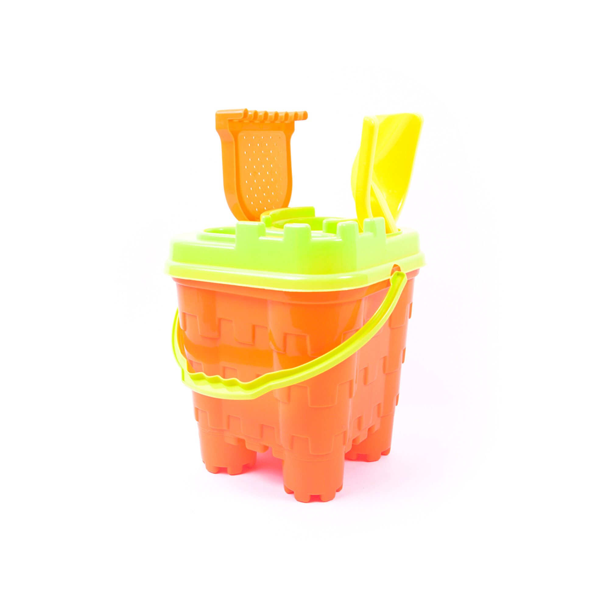 Sada obsahuje: Sítko, lopatku, hrábě, kyblík, konvičku a bábovičky.