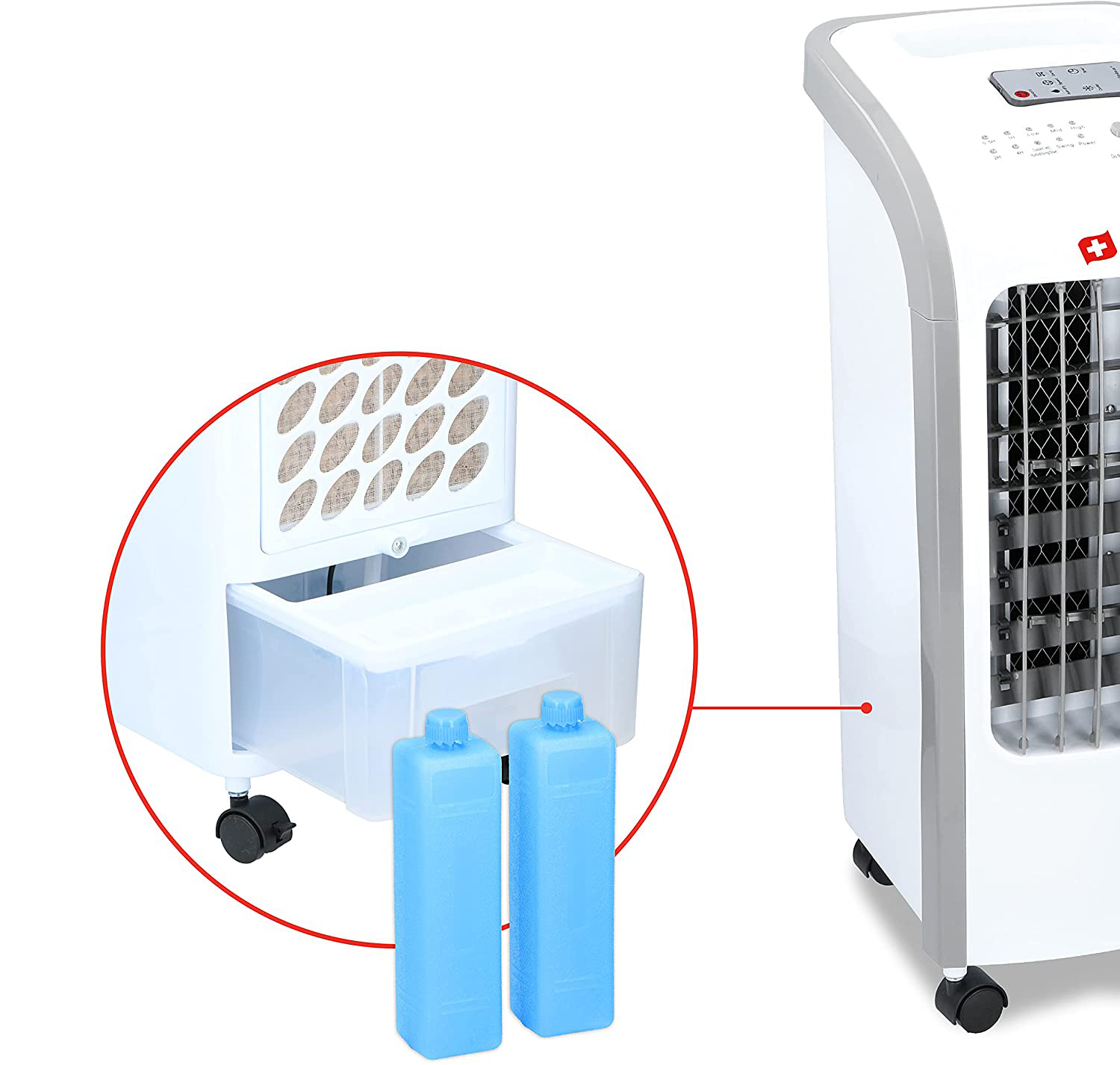 Vzduch v ochlazovači prochází přes chladnou vodu nebo led a tím poskytuje mnohem více ochlazení, než je tomu u běžného ventilátoru. Součástí balení jsou dvě chladící vložky, které můžete používat střídavě. Hladinu vody můžete sledovat na přední straně nádržky.