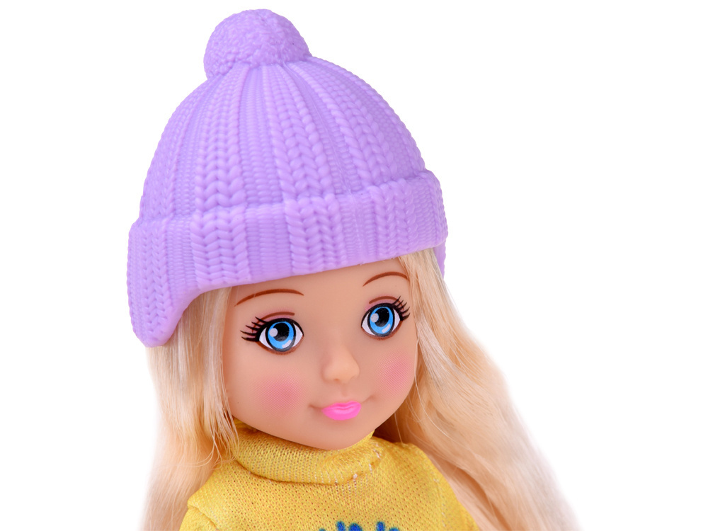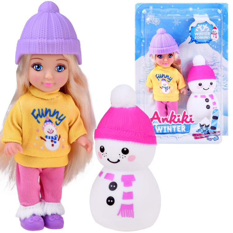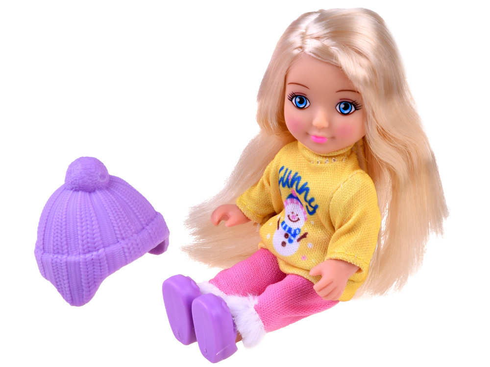 Rozkošná malá panenka o rozměrech cca. tento 13 cm model oblečený do teplé čepice s bambulí, žluté mikiny, růžových kalhot a teplých bot s kožešinou vám umožní vytvořit spoustu zábavných her. Panenka má dlouhé blonďaté vlasy, které lze použít k česání culíků, copánků a rozverných účesů. Panenku doprovází rozkošný bílý sněhulák v růžové čepici s bílou bambulí.