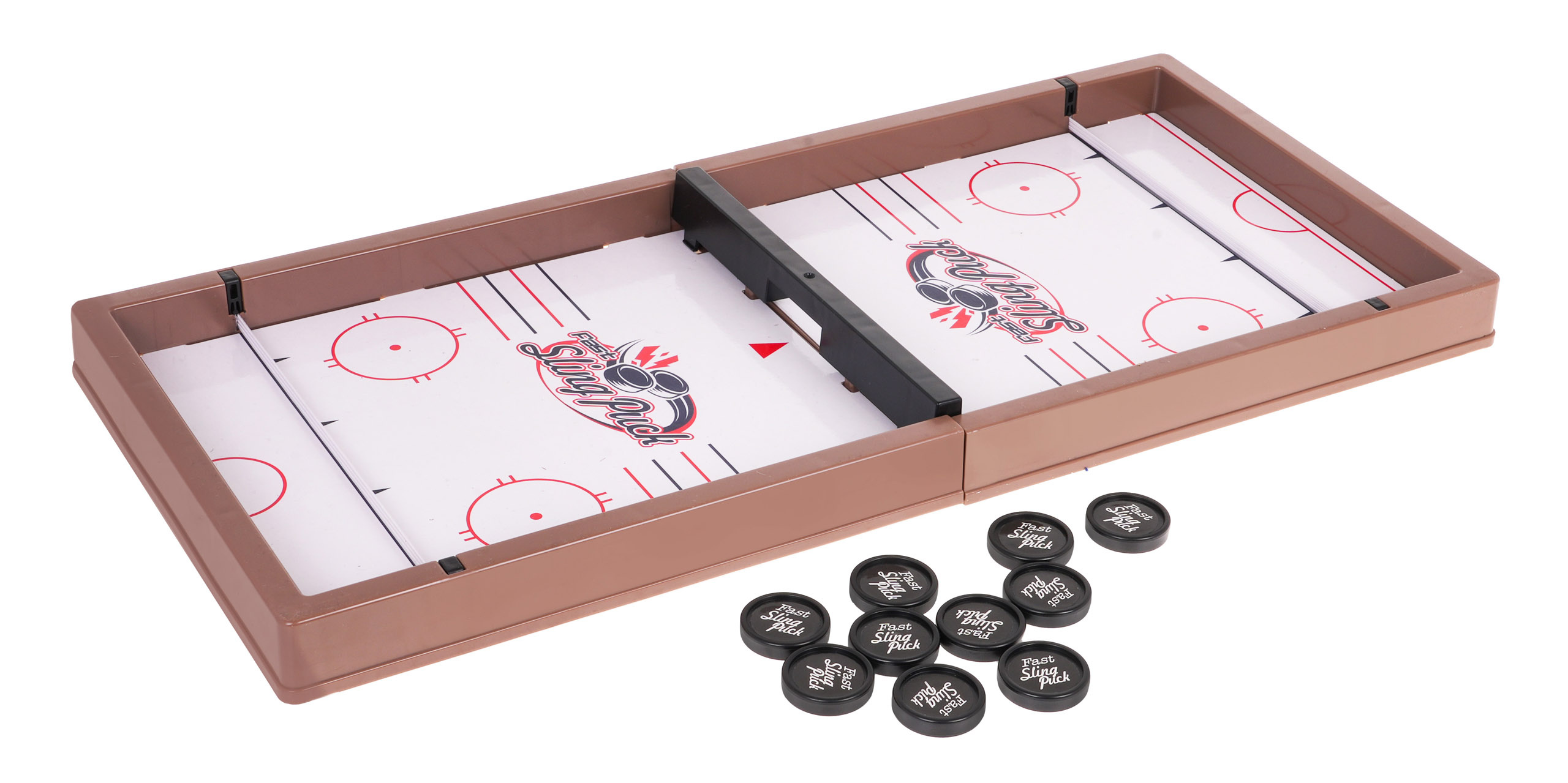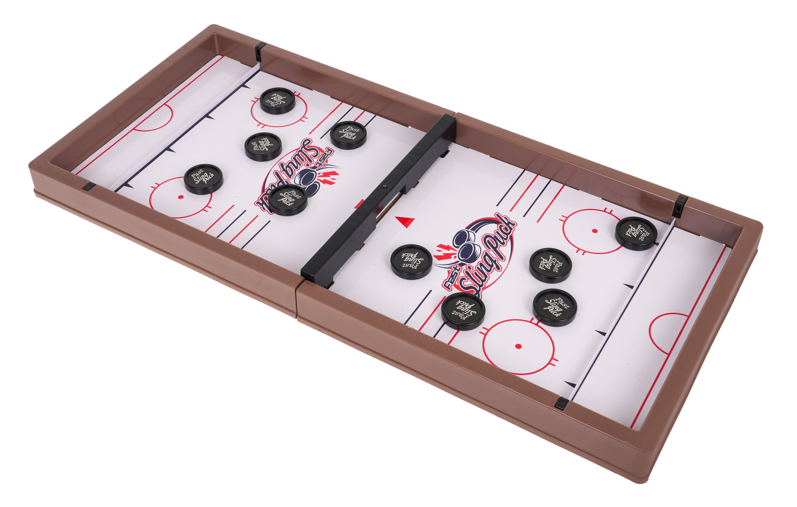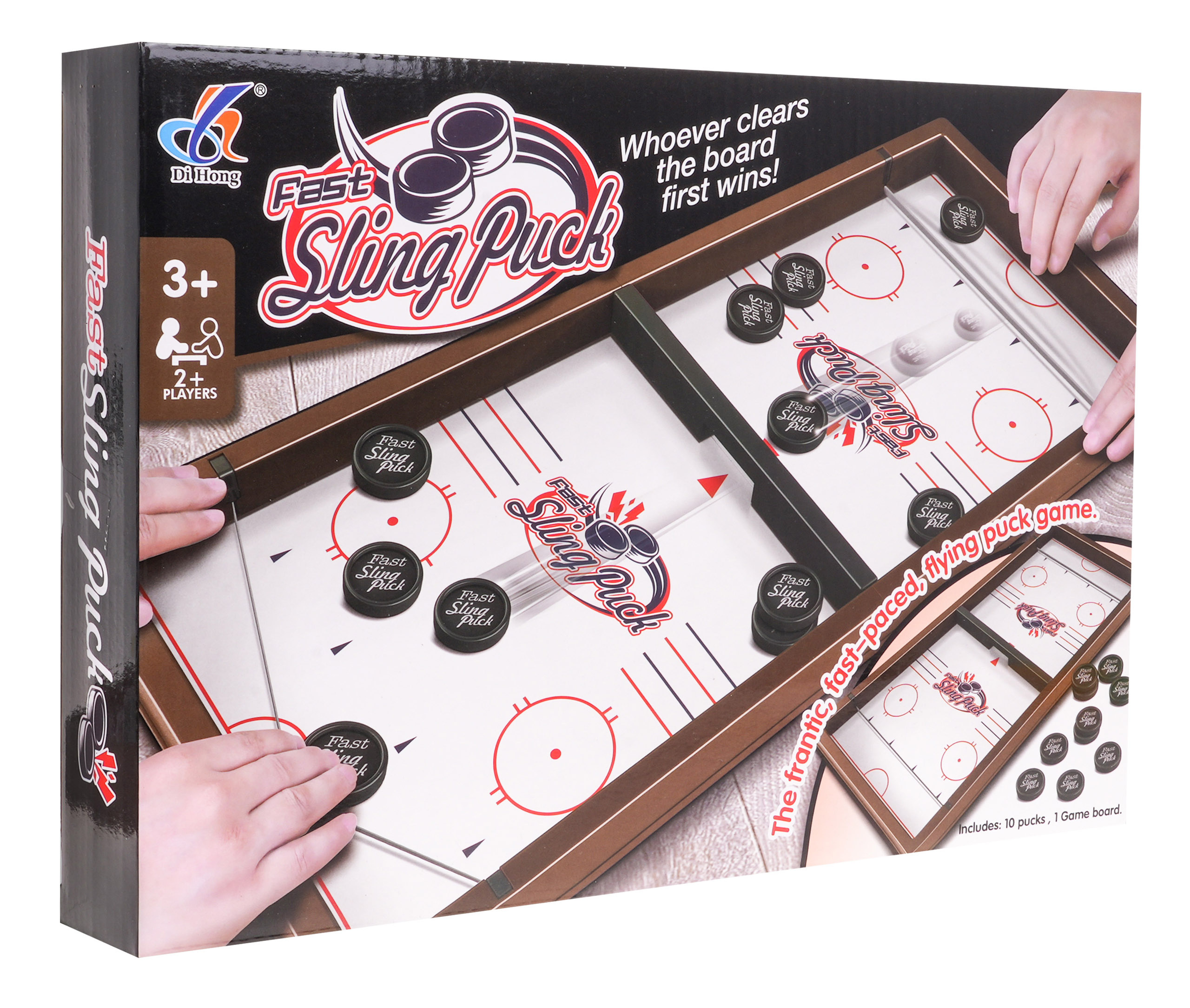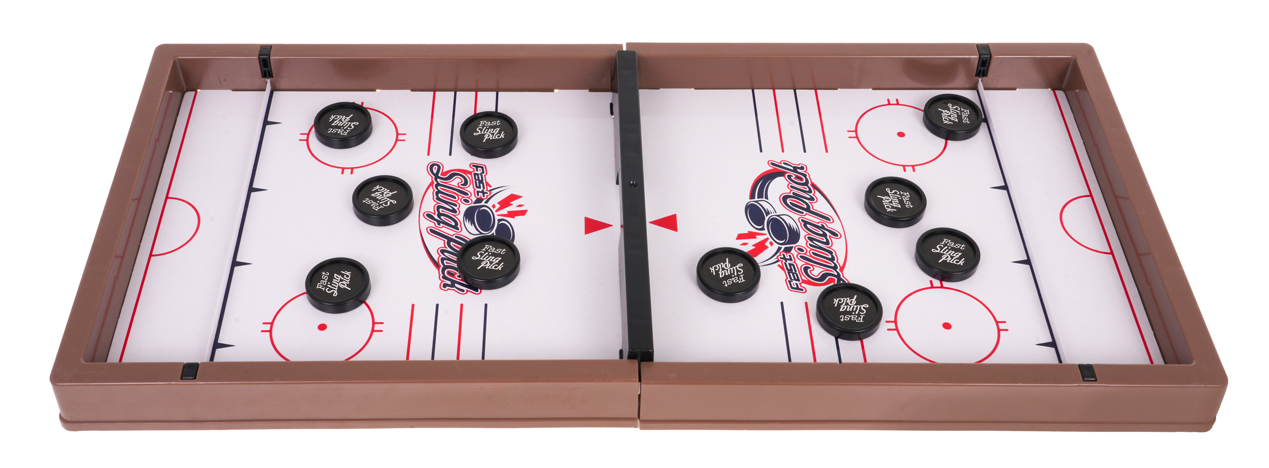 - pomocí gumiček natažených na opačných koncích hrací plochy střílejte puky střídavě,