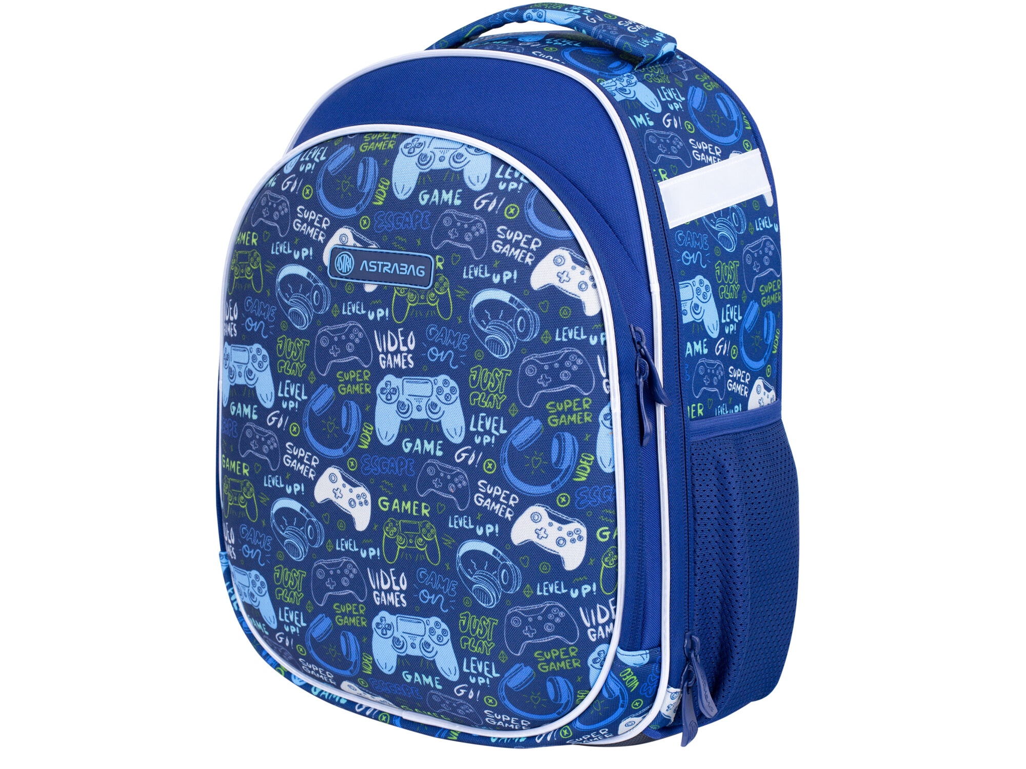 Ergonomický školní batoh se dvěma samostatně uzavíratelnými komorami a dvě boční kapsy ze síťoviny, do kterých se vejde láhev nebo termoska.
