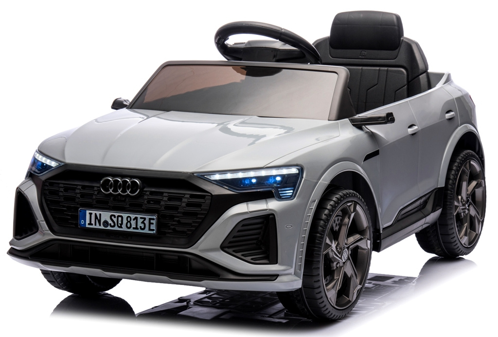 Sportovní dětské auto kabriolet na akumulátor dálkově ovládané na dálkový ovladač KABRIO AUDI SQ8 HUDBA + KLAXON + ZÁSUVKA MP3 + DÁLKOVÝ OVLADAČ 2.4G LICENCE AUDI PĚNOVÁ KOLA EVA, Měkká Sedačka z Ekokůže Rozměry autíčka: 100x54x48cm BARVA ŠEDÁ
