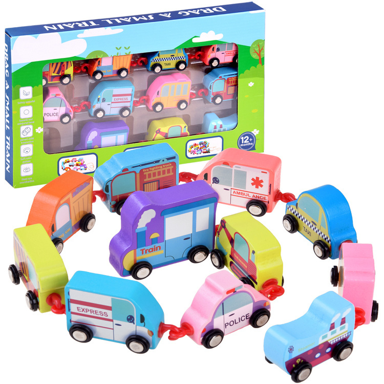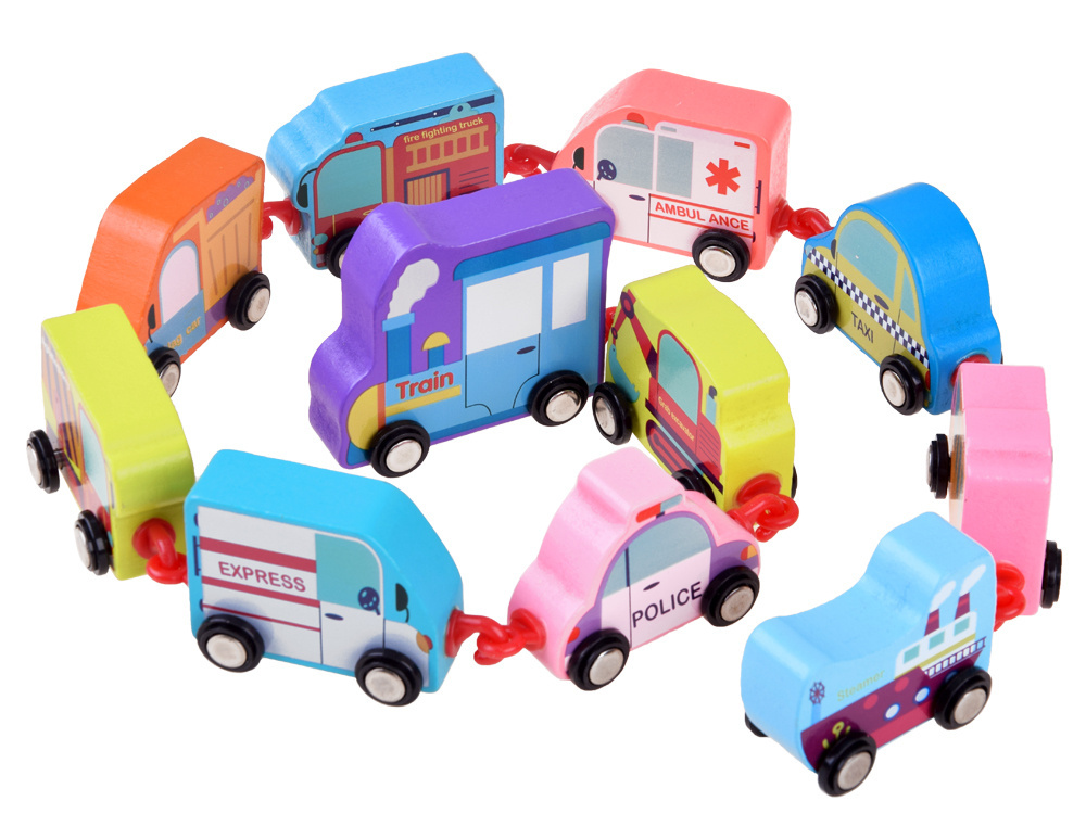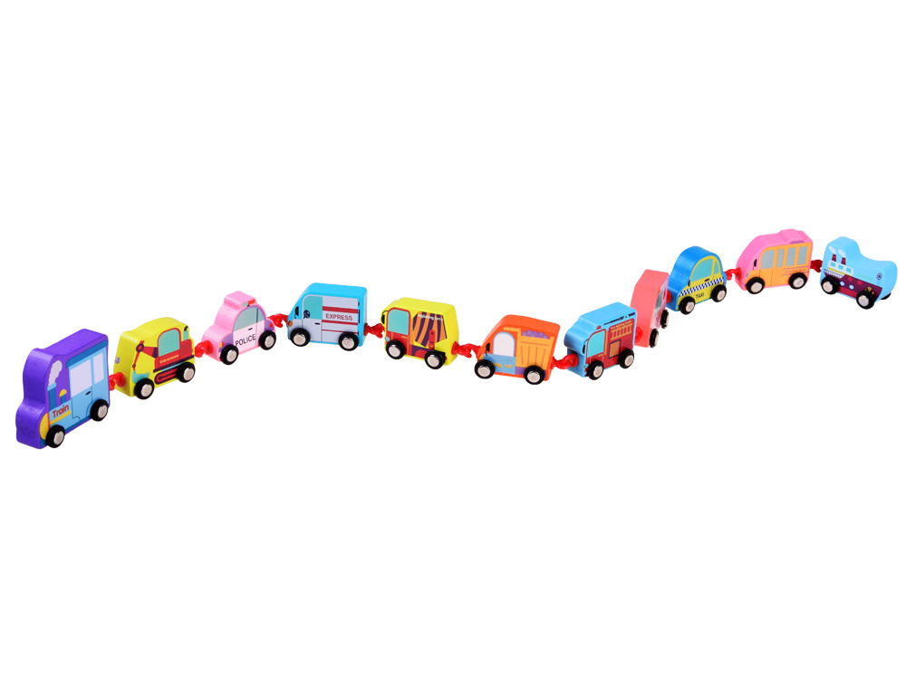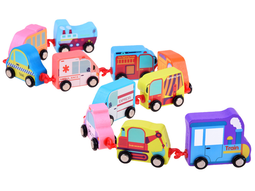Dřevěný vláček ve fantastických barvách napodobuje vozidla každodenní potřeby.