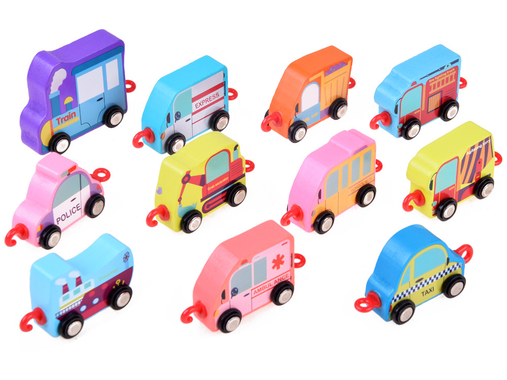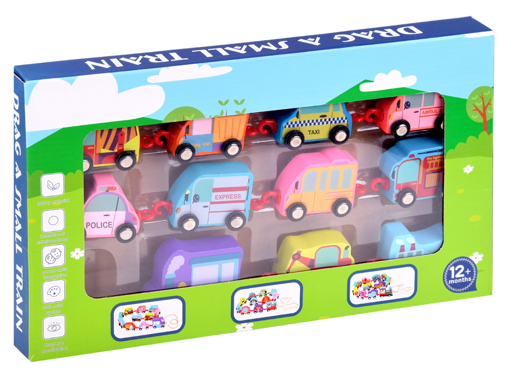 Hračka vyrobená ze dřeva, s plastovými koly a háky. Barvy a grafika vagonů jsou velmi atraktivní a povzbudí každé dítě ke hře.