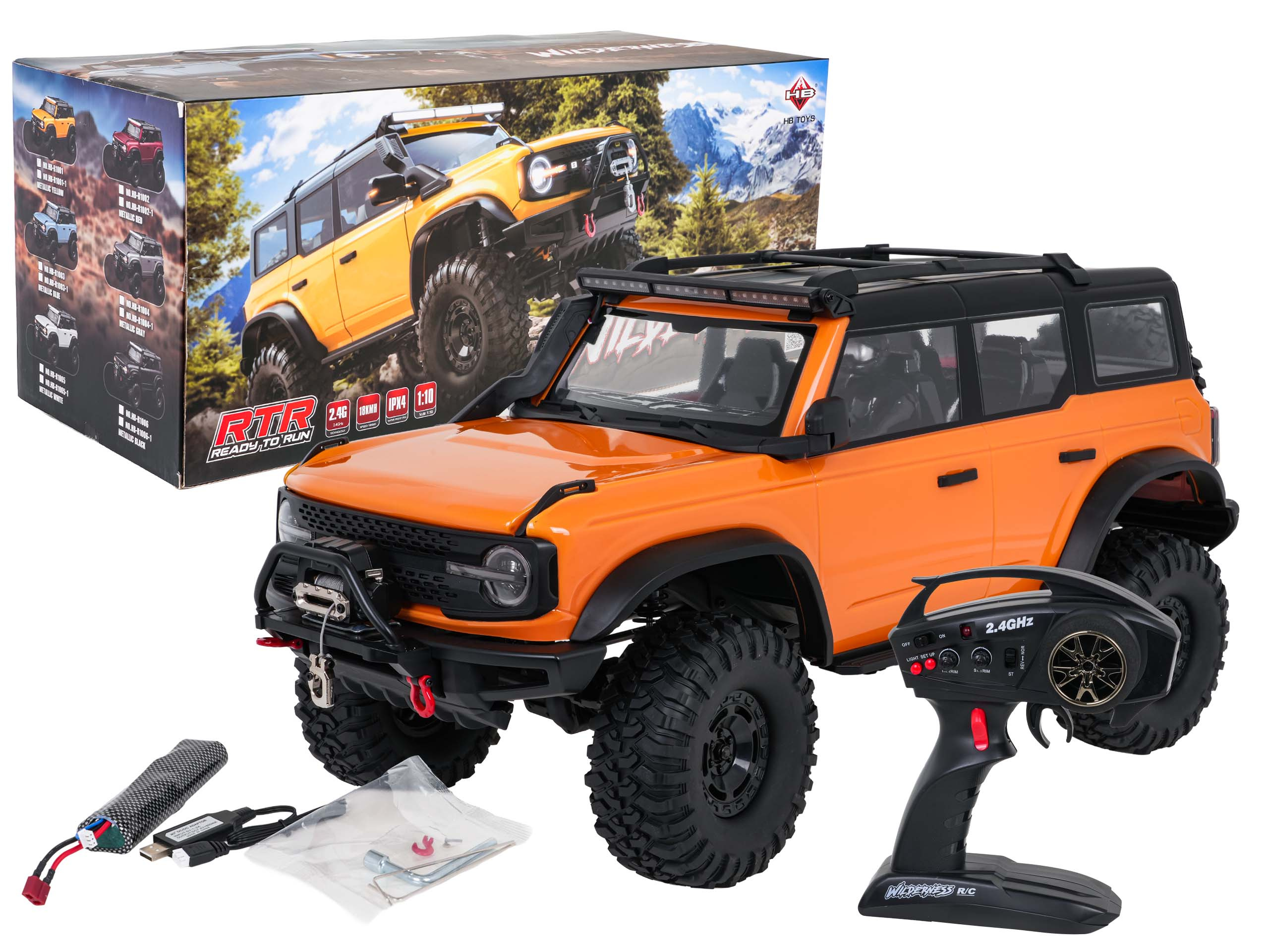 Dálkově ovládané auto Wilderness, vyrobené v měřítku 1:10, pro děti od čtrnácti let. Vozidlo má lakovanou karoserii, LED osvětlení: světlomety, brzdová světla, zpětná světla, směrová světla, po setmění vypadá nádherně. Individuální zavěšení na každé kolo, kovové tyče u ramen, vestavěný zadní a přední diferenciál. Velké gumové pneumatiky s běhounem, velmi velký úhel natočení způsobuje, že vozidlo překoná jakýkoli povrch. Na zadní části vozidla se nachází plnohodnotné rezervní kolo. Vozidlo jezdí všemi směry, snadno překonává překážky a navíc je vodotěsné. Maximální rychlost vozidla je 18 km/h, z ovladače můžeme nastavit konstantní rychlost vozidla. Na výběr máme dvě rychlosti. Auto je napájeno akumulátorem typu 7,4 V (v balení) a 4 x AA 1,5 V (není v balení) - ovladač.