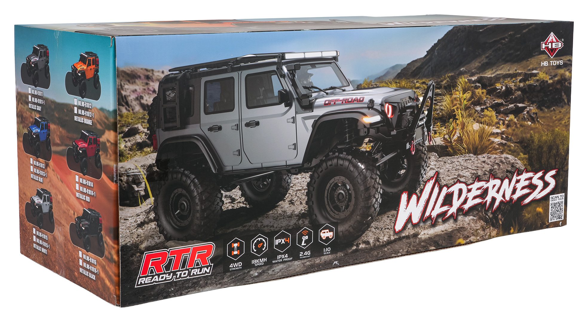 Dálkově ovládané auto Wilderness, vyrobené v měřítku 1:10, pro děti od čtrnácti let. Vozidlo má lakovanou karoserii, LED osvětlení: světlomety, brzdová světla, zpětná světla, směrová světla, po setmění vypadá nádherně. Individuální zavěšení na každé kolo, kovové tyče u ramen, vestavěný zadní a přední diferenciál. Velké gumové pneumatiky s běhounem, velmi velký úhel natočení způsobuje, že vozidlo překoná jakýkoli povrch. Na zadní části vozidla se nachází plnohodnotné rezervní kolo. Vozidlo jezdí všemi směry, snadno překonává překážky a navíc je vodotěsné. Maximální rychlost vozidla je 18 km/h, z ovladače můžeme nastavit konstantní rychlost vozidla. Na výběr máme dvě rychlosti. Auto je napájeno akumulátorem typu 7,4 V (v balení) a 4 x AA 1,5 V (není v balení) - ovladač.