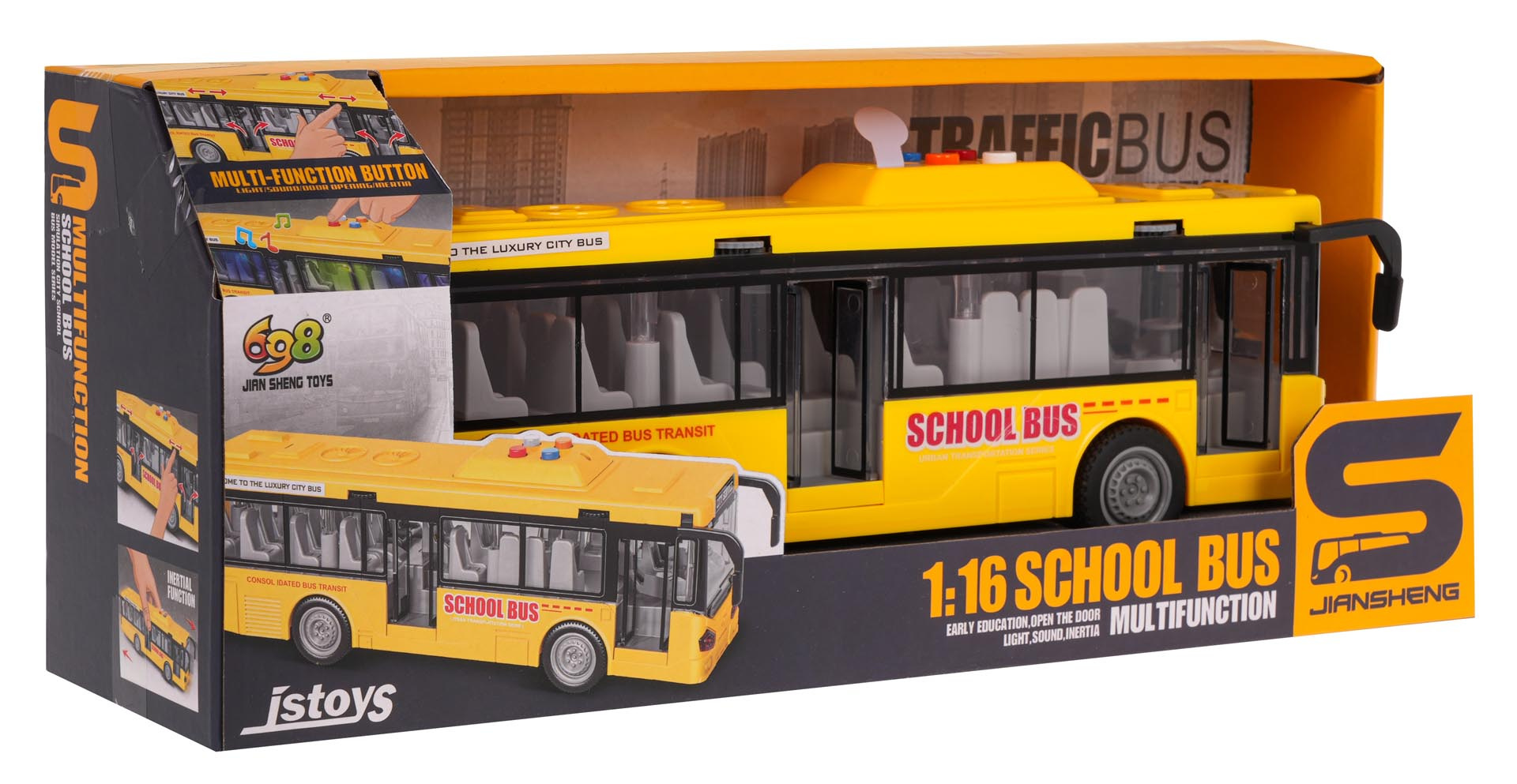 Žlutý autobus s funkcí zvuku a světla pro děti od 3 let. Autobus je vyroben v měřítku 1:16, je plný detailů a má otevírací boční dveře pomocí knoflíku umístěného nad nimi. Na střeše autobusu se nacházejí zvuková tlačítka, po jejichž stisknutí uslyšíme klakson, otevírání dveří, zvuk startujícího motoru nebo couvání. Každý zvukový efekt je doprovázen rozsvícením modrého a zeleného světla uvnitř autobusu. Vozidlo má gumová kola a třecí pohon – pull-back. Hračka je napájena bateriemi typu 3 x AG13 (v balení).