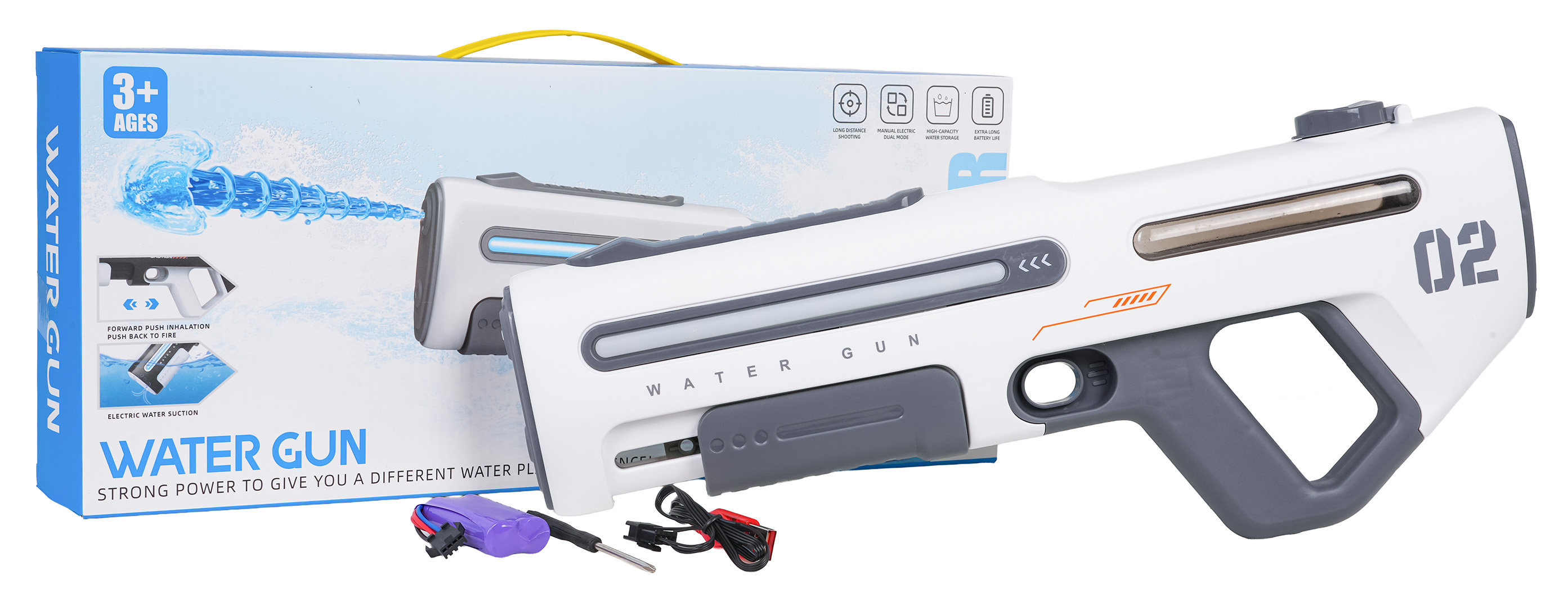 Elektrická vodní pistole s podsvícením pro děti od tří let. Pistole je vyrobena z nejkvalitnějších materiálů, napájena je akumulátorem typu 7,4V (v balení). Má podsvícení, což umožňuje zábavu i pozdě večer. Zásada fungování pistole je velmi jednoduchá. Doplňujeme nádržku na vodu, která se nachází v horní části pistole. A stiskneme spoušť. Pistole může být také používána bez napájení, manuálně.