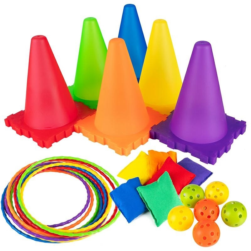 Sada na hru ringo, k použití doma i venku. Hra ovlivňuje pohybový rozvoj dítěte, umožňuje cvičit koordinaci a dovednosti. V sadě: - sáček-1ks - barevné kužely- 6ks (výš. 18 cm, šíř.13,5 cm, hl. 13,5 cm) - barevné sáčky - 6 ks - barevné obruče O14 cm – 6 ks - barevné obruče O16 cm – 6 ks. - barevné kuličky – 6 ks. Rozměry balení: 26,5x14,5x14 cm Nevhodné pro děti do 3 let. množství na paletě: 192 ks