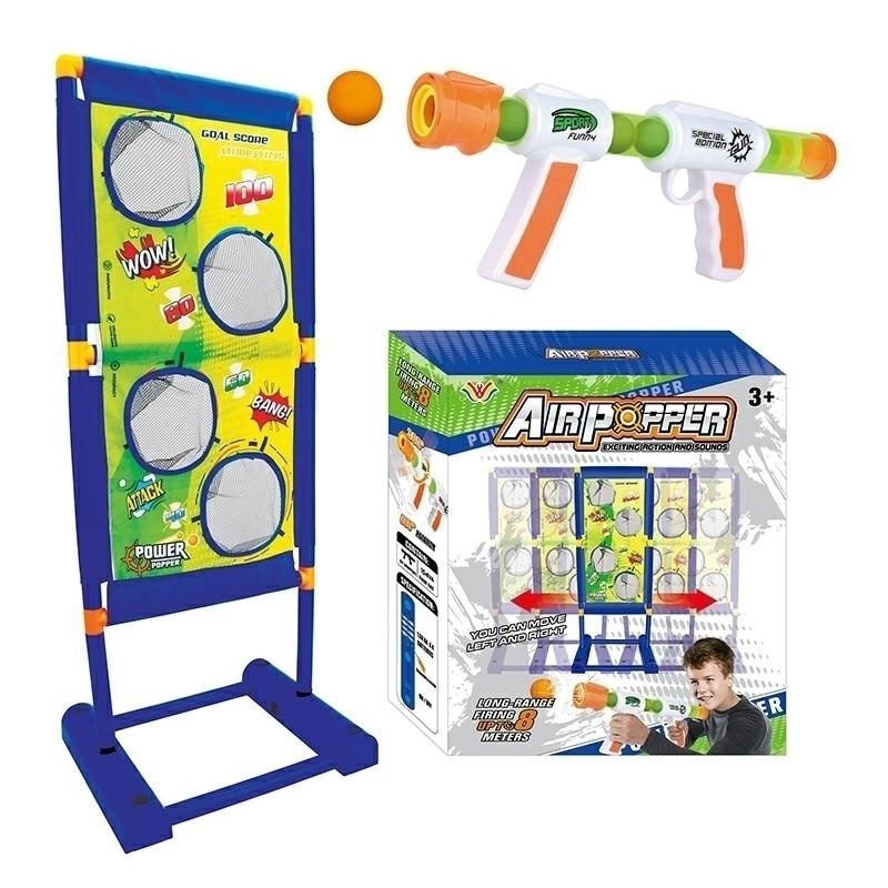 Vystřelovač měkkých pěnových míčků je zárukou bezpečné a vzrušující zábavy. Stačí vložit kuličky z pěny EVA do vystřelovače, nabít a vystřelit! K sadě byl přiložen terč s bodovanými cíli. Sčítej získané body a staň se mistrem! Oddálil terč, aby zvýšil úroveň obtížnosti - dosah vrhače je až 8 m. 15 koulí zajistí dlouhou zábavu bez nutnosti sbírat munici po každém výstřelu. Štít se pro ztížení pohybuje doleva a doprava (na výběr jsou 2 úrovně obtížnosti). Specifikace: dél. vystřelovače: 50 cm rozměry terče: 41x30x100 cm průměr míčku: 2,8 cm 2 úrovně obtížnosti materiál míčku: měkká pěna EVA napájení na baterie: 4xAA 1.5V terč se pohybuje doleva a doprava v náhodných kombinacích rozměry balení: 35x12,5x40cm Hračka je určena pro děti od 3 let. Množství ks. na paletě: 88