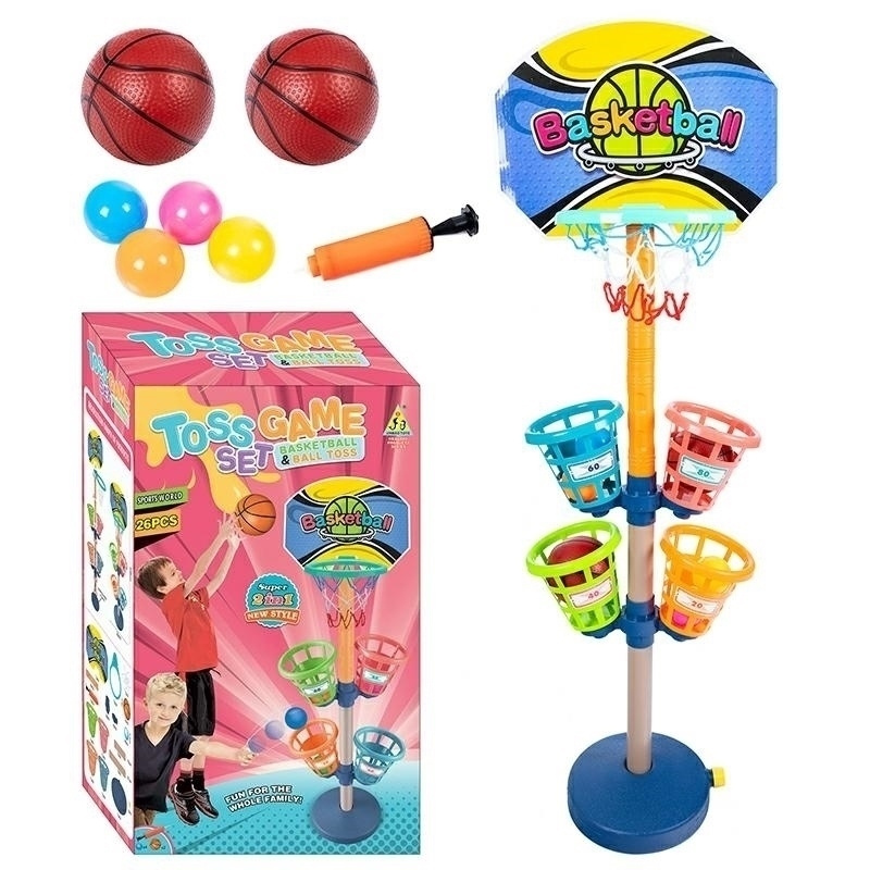 Sada 2v1 pro hraní basketbalu a házení míčky. To je ideální nápad na aktivní trávení volného času jak doma, tak na čerstvém vzduchu. Sada má základnu, kterou lze naplnit vodou nebo pískem. Obsah sady: 1 hlavní koš na basketbal (vnější průměr obruče: 19,5 cm) 4 boční koše na házení míčky 2 nafukovací basketbalové míče o prům. 10 cm v sadě 4 barevné míčky o průměru. 5,5cm pumpička na míče s jehlou rozměry: 108x35x35cm rozměry balení: 27x14x44cm Hračka určena pro děti od 3 let. Množství ks. na paletě: 72