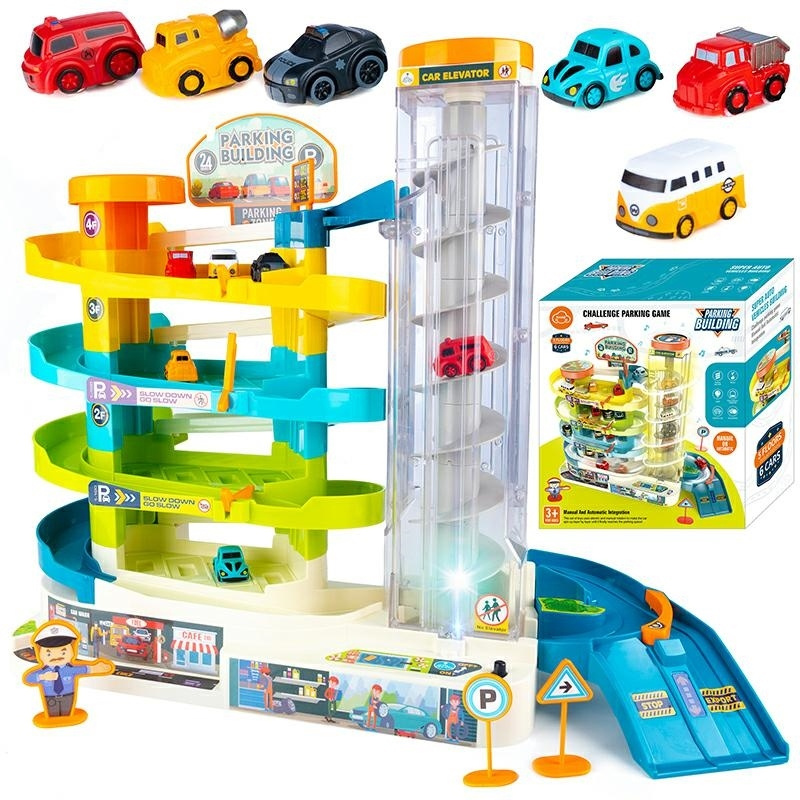 Parkoviště pro auta - skluzavka s výtahem. Dráha je vybavena speciálním spirálovým výtahem, který je ovládán manuálně nebo elektricky a zvedá auta na nejvyšší úroveň. Přímo z výtahu auta sjíždějí kolem celého parkoviště dolů přímo do výtahu. Specifikace: napájení (volitelné): 3xAA (není součástí balení) 5 pater parkoviště 6 aut závory na patrech pro blokování průjezdu rozměry (š./hl./vys.): 42x13x34,5cm Hračka určena pro děti starší 3 let. rozměry balení: 31x34x14cm Množství ks. na paletě: 100 Produkt zabalený v dodatečné krabici - připravený k odeslání.