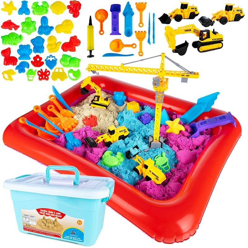 Magický kinetický písek, který nevysychá ani netvrdne ani po opakovaném použití. Bez použití vody snadno vytvoříš jakoukoli stavbu, postavu atd. Po skončení hry se písek vrací do původní formy. Vaše dítě se bude cítit jako na pláži, když bude tvořit stavby a bábovky z písku. Nepřilepuje se na ruce, oblečení a jiné předměty. To vše činí kinetický písek ideálním pro hraní doma, ve školce a v terapeutické místnosti. V sadě: - písek různých barev - 4 kg - nafukovací pískoviště 55x42x7cm - 29 formiček různých tvarů - 9 nástrojů (lopatka, hrábě atd.)) - 4 modely stavebních vozidel - pumpička - uzavíratelný kufřík 29x20x15cm rozměry balení 30x22x18cm Počet ks. na paletě: 80