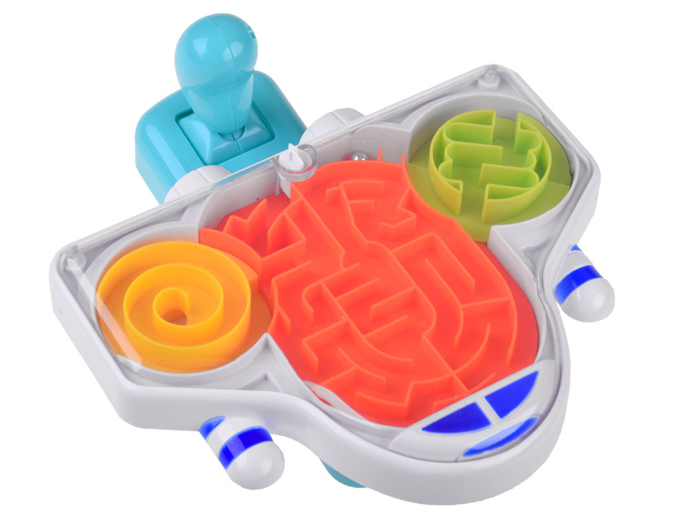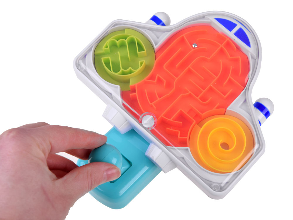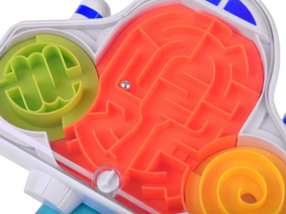 Bludiště uzavřené ve vesmírné raketě se bude líbit každému malému kosmonautovi. Hračka má joystick pro ovládání míče. Kovová kulička uzavřená v lodi má za úkol projít bludištěm ze zeleného pole přes oranžové a dostat se do žluté oblasti s bludištěm a pak naopak.