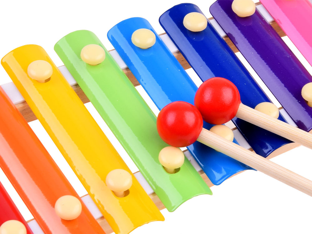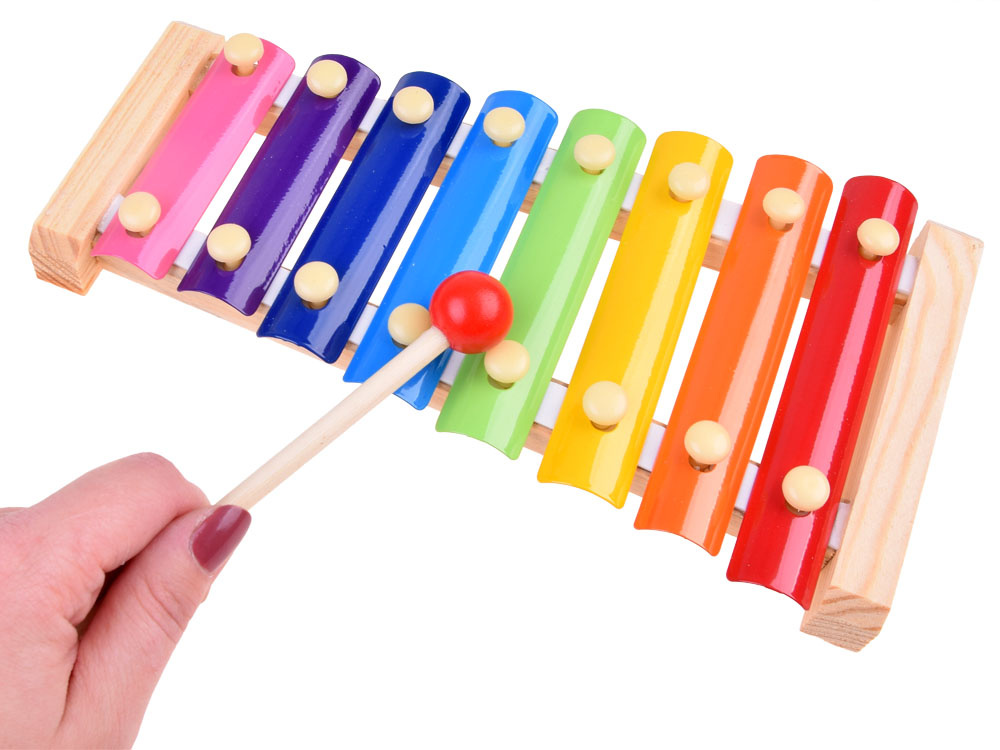 Hračka z přírodního dřeva s kovovými barevnými destičkami. Součástí sady jsou noty na cimbál, které vaše dítě bude moci použít, až se bude poprvé učit hrát na cimbál.
