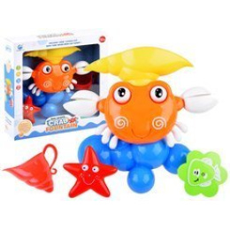 - Krab má speciální nádobu, díky které lze nalít vodu do mušle umístěné na jeho hlavě, dítě pak v hračce objeví atrakce, jako jsou pohyblivé klepeta, oči, hvězdice a květina s rybou z krabovy tlamy vznikne malá fontánka.