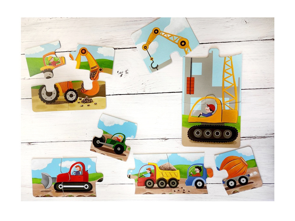 Jaké zvuky vydává míchačka na beton? Co dělá bagr? Kdo obsluhuje jeřáb? Výjevy vyobrazené na skládačkách inspirované dětskými otázkami poskytnou batolatům spoustu zábavy a uspokojí jejich zvědavost.