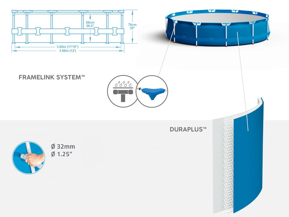 Kvalitní pozinkovaný ocelový rám odolný proti korozi, díky kterému je bazén velmi stabilní.Vestavěný ventil pro regulaci průtoku a odtoku vody. Velmi snadná a rychlá montáž - lze ji provést bez použití nářadí!