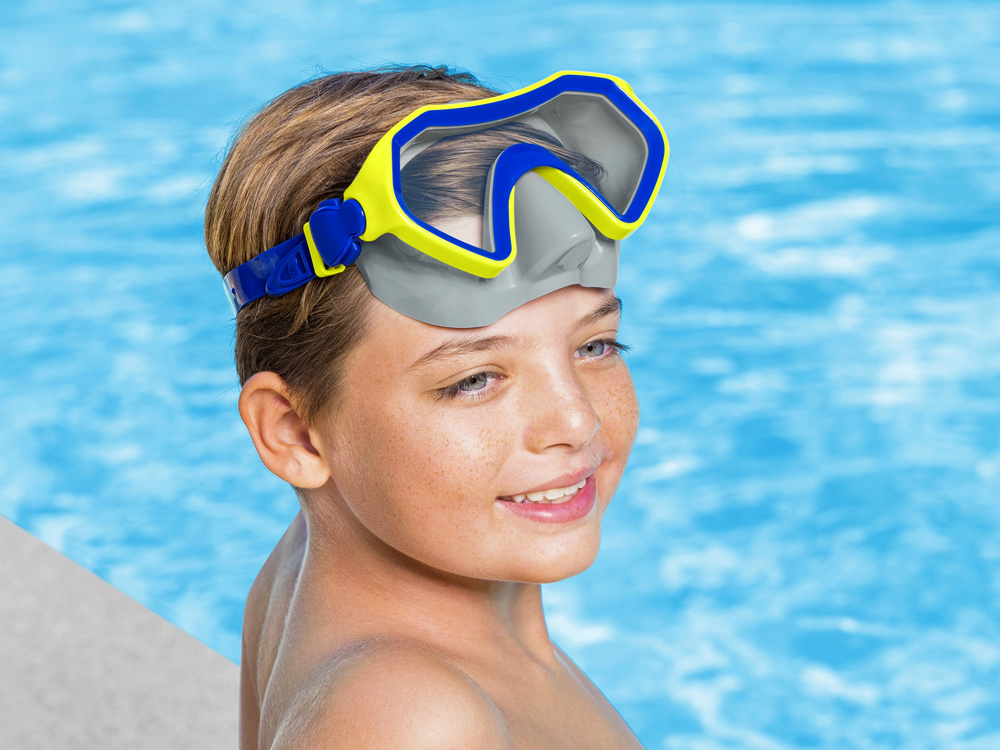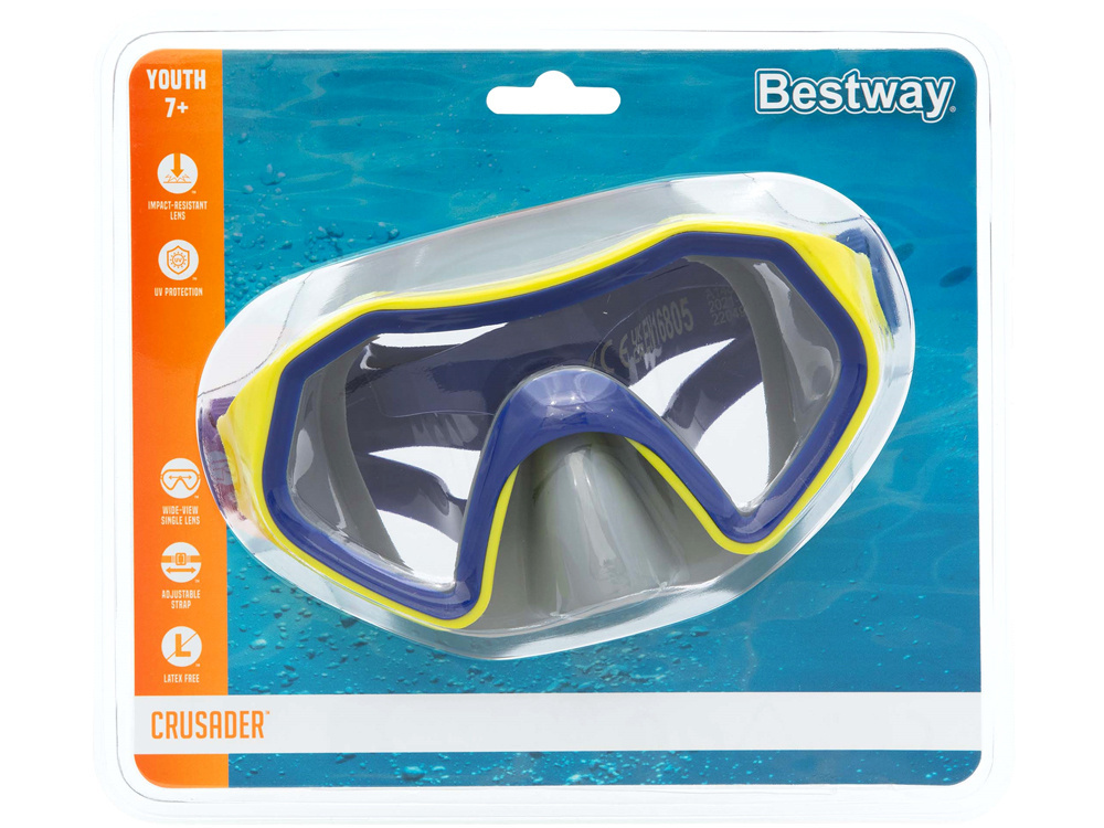 Barevná plavecká maska Bestway® Crusader byla navržena pro děti již od 7 let a je vhodná pro jejich první lekce plavání. Byl vytvořen s ohledem na pohodlí a bezpečnost nejmenších dětí při objevování moře. Díky nastavitelným popruhům lze masku snadno přizpůsobit hlavě uživatele.Maska je vyrobena z polykarbonátu, takže je odolná proti nárazu, a má UV ochrannou vrstvu, která chrání oči vašeho dítěte před ostrými slunečními paprsky při potápění a šnorchlování ve vodě.