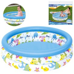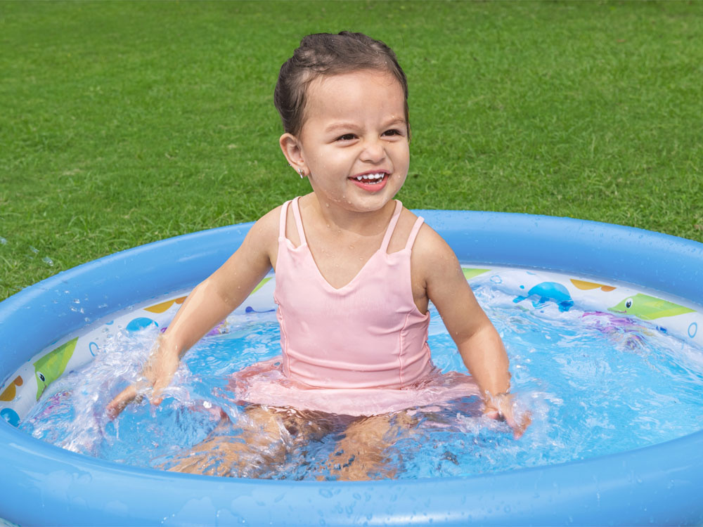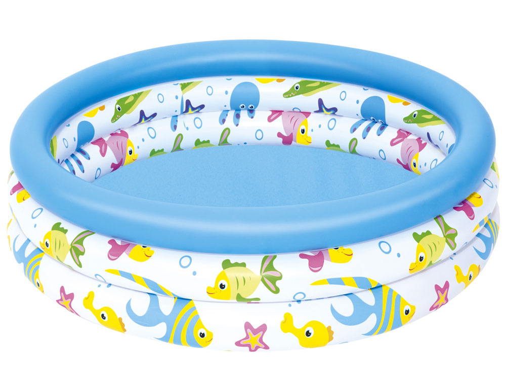 Nafukovací barevný bazén s grafikou podmořského světa je určen pro nejmenší děti. Bazén se skládá ze 3 nafukovacích kruhů se vzduchovým uzávěrem. Je vyroben z odolného vinylu o tloušťce 0,19 mm. Skvěle se hodí na zahradu, na pláž i na dovolenou.