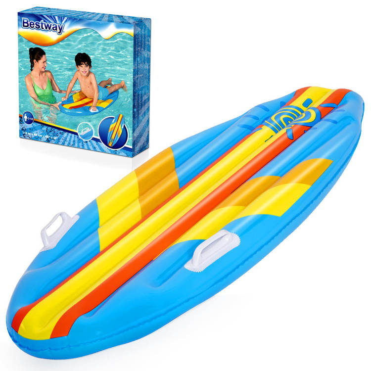 Společnost Bestway představuje nafukovací surfovací prkno, které si naše ratolest bude moci vzít do bazénu i na dovolenou k moři nebo jezeru. Barevná nafukovací deska má vzduchový zámek, je vyrobena z pevného, odolného vinylu a je založena na podélných přepážkách.Kromě toho výrobce vybavil prkno dvěma pevnými a praktickými držadly pro pohodlné plavání a přepravu. To dítěti pomůže udržet se na hladině.Zábava u moře, jezera nebo bazénu bude ještě atraktivnější.S tímto druhem zábavy se vaše dítě o letních prázdninách rozhodně nebude nudit.