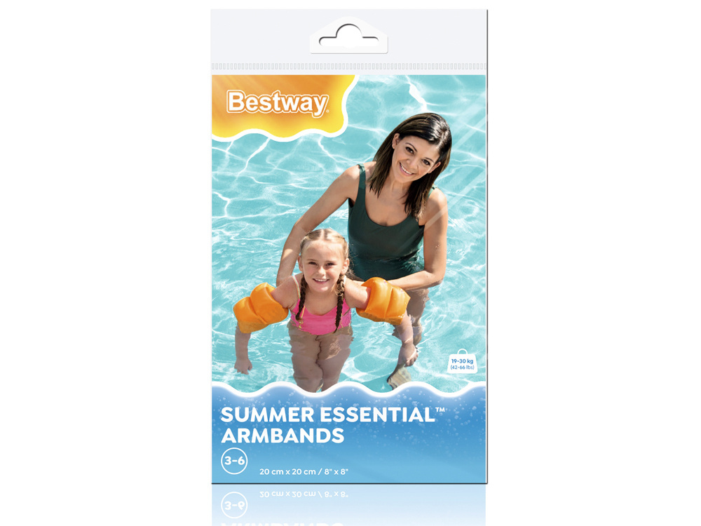 Rukávky Bestway Swim Learning Sleeves jsou nezbytnou výbavou každého batolete při hře v bazénu, moři nebo jezeře.Motýlci v letní oranžové barvě jsou velmi dobře tvarovaní, takže nijak neomezují volnost pohybu při plavání i hraní ve vodě. Vaše dítě se bude při hře nebo výuce plavání ve vodě cítit bezpečně. Návleky mají odolné ventily a dvě vzduchové komory , snadno se nafukují bez použití nafukovačky, jsou chráněny ventilem, který zabraňuje neplánovanému úniku vzduchu, a jsou vyrobeny z odolného vinylového materiálu.