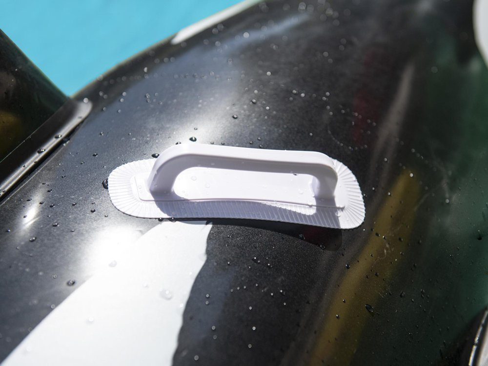 Nafukovací kosatka je vyrobena z 0,27 mm silného vinylu a má zesílené rukojeti, aby se s ní dalo pohodlně šplouchat v mořských vlnách.