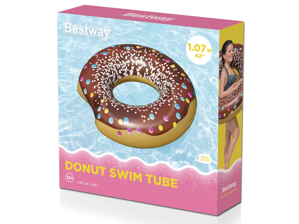 Nafukovací velké vodní kolo ve tvaru barevné koblihy, které se skvěle hodí na dovolenou nebo k bazénu. Společnost Bestway se v souladu s nejnovějšími trendy snaží vyrábět senzační a jedinečné modely pro dospělé i děti. Krásné barvy a originální design jistě upoutají pozornost ostatních rekreantů, protože nafukovací kobliha je skutečným hitem již několik sezón.Toto fantastické kolo o průměru 107 cm mohou používat k plavání dospělí i děti starší 12 let. Vyrobeno z vysoce odolného vinylu o tloušťce 0,24 mm. Má také bezpečnostní ventil, který zabraňuje ztrátě vzduchu.Plážové kolečko je lehké a praktické. Nezabírá mnoho místa a nevyžaduje čerpadlo, takže ji lze snadno vzít kamkoli s sebou.