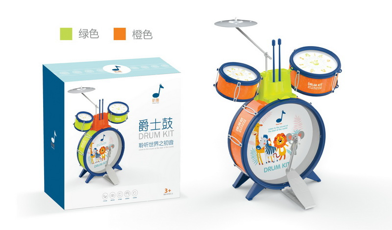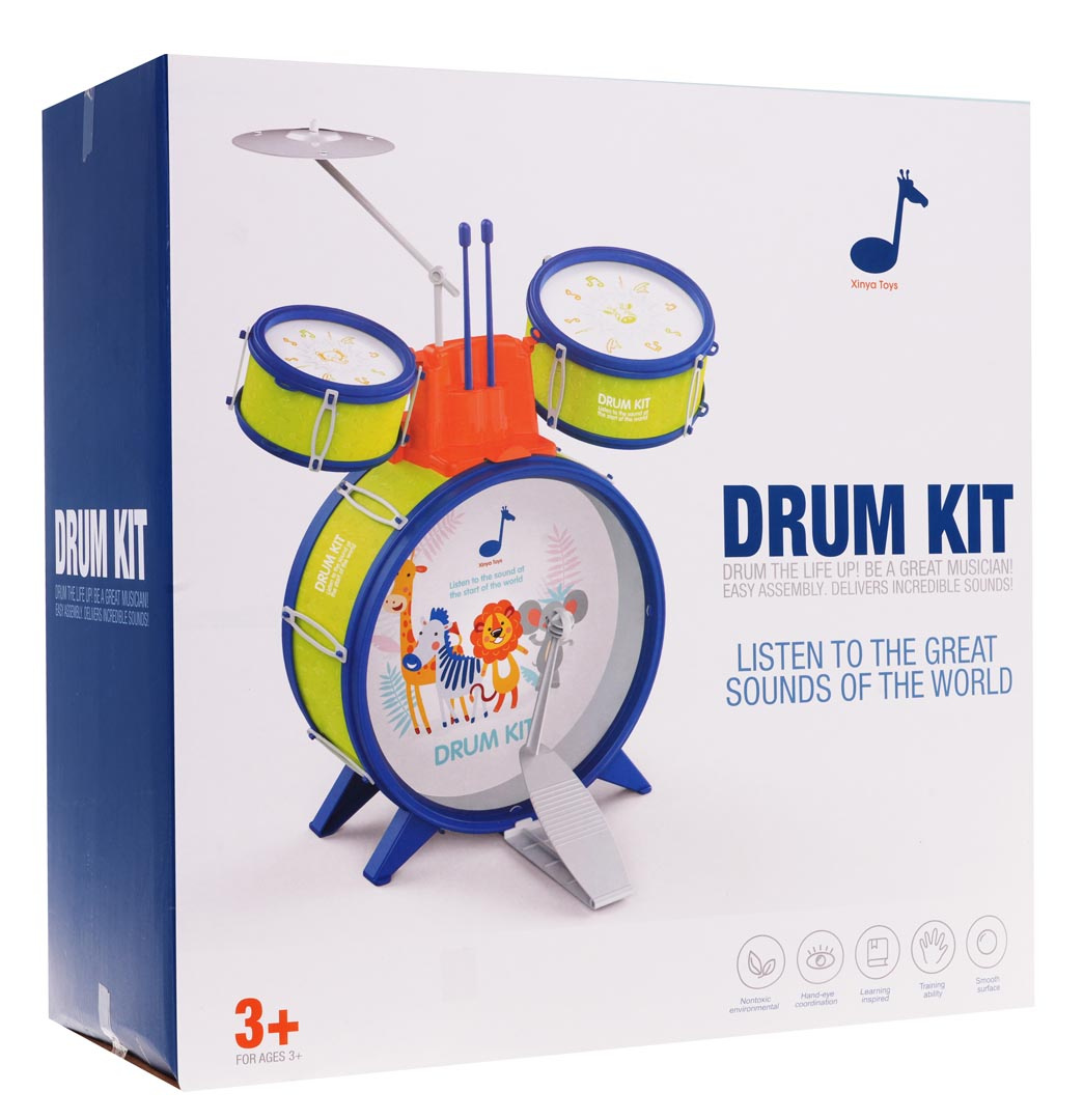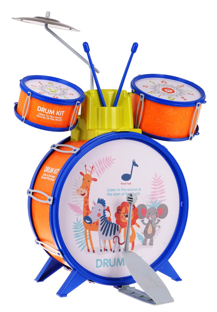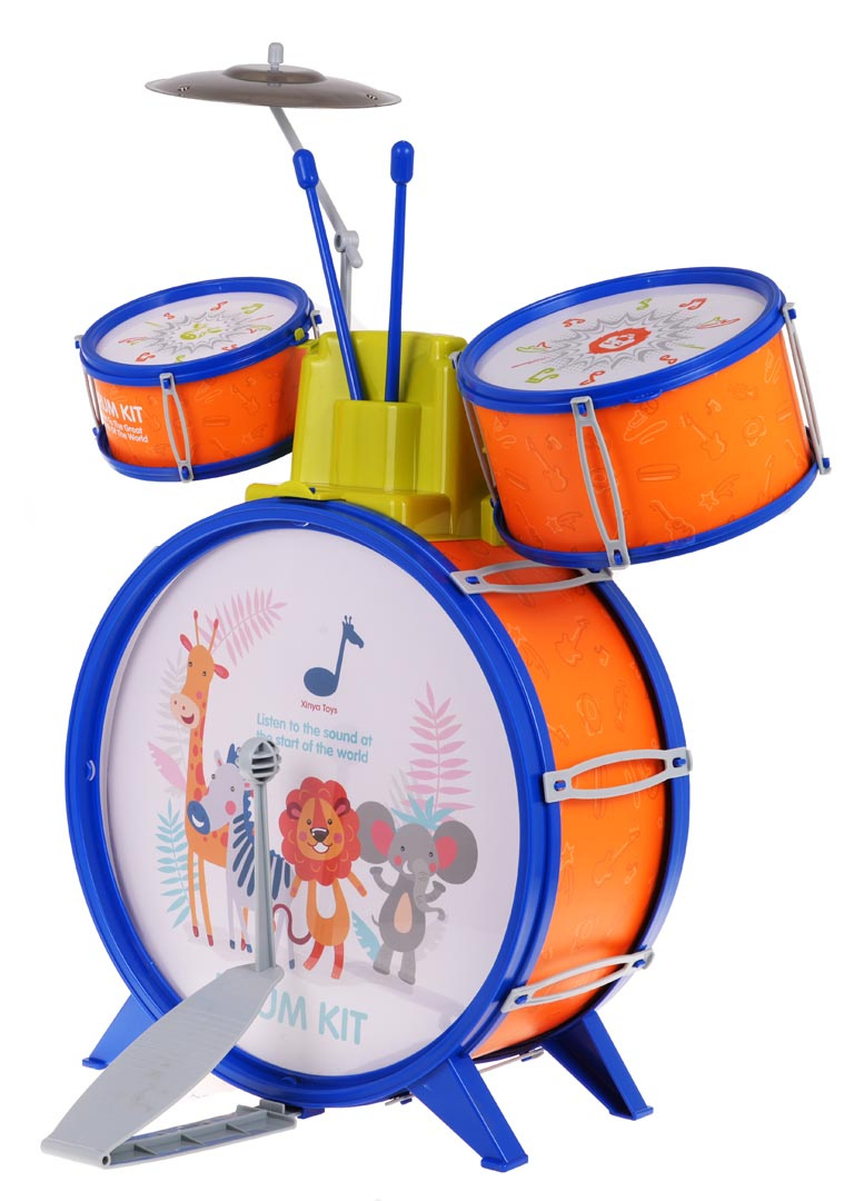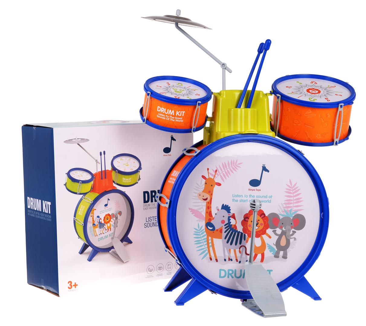 Barevná bicí souprava Safari pro děti od 3 let. Sada se skládá ze 3 bubnů, činelů a paliček. Byl vyroben z nejkvalitnějších materiálů v živých barvách, které přitahují pozornost dítěte a povzbuzují ke hře. Na velkém bubnu je obrázek se zvířátky. Zvuk z velkého bubnu se spouští po sešlápnutí nožního pedálu, a z horních bubnů a činelů po úderu paličkami. Hra s touto sadou rozvíjí zájem o hudbu a talent dítěte, učí smyslu pro rytmus a procvičuje koordinaci ruky a oka.