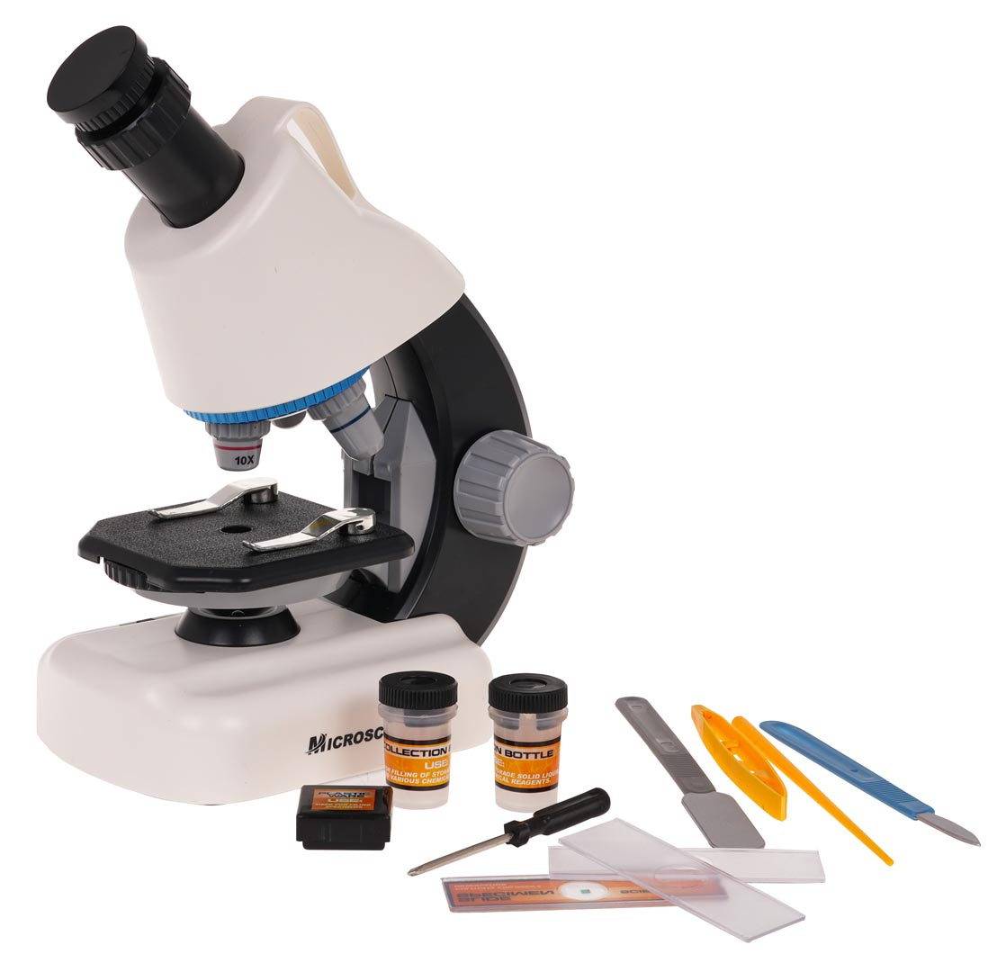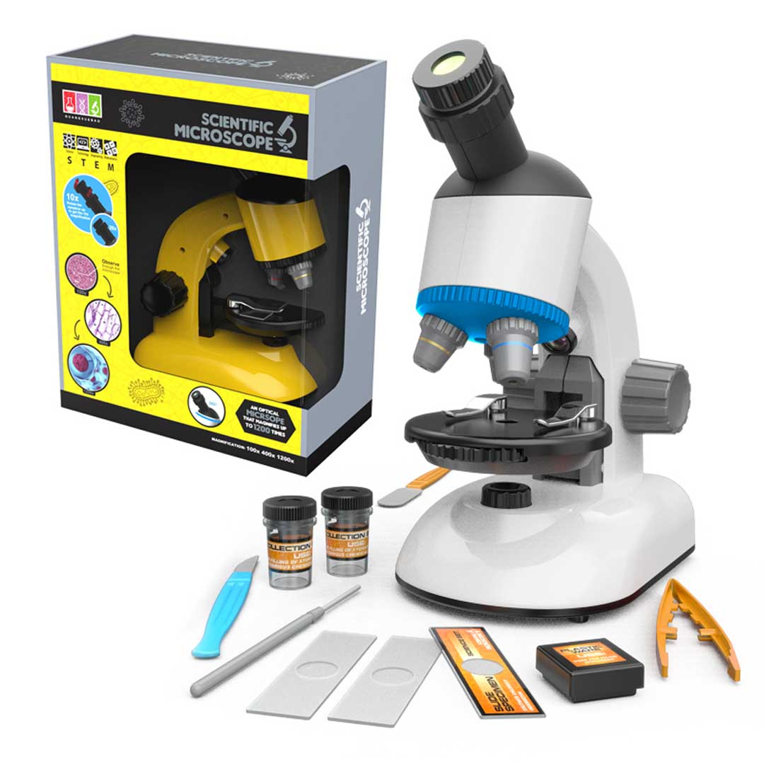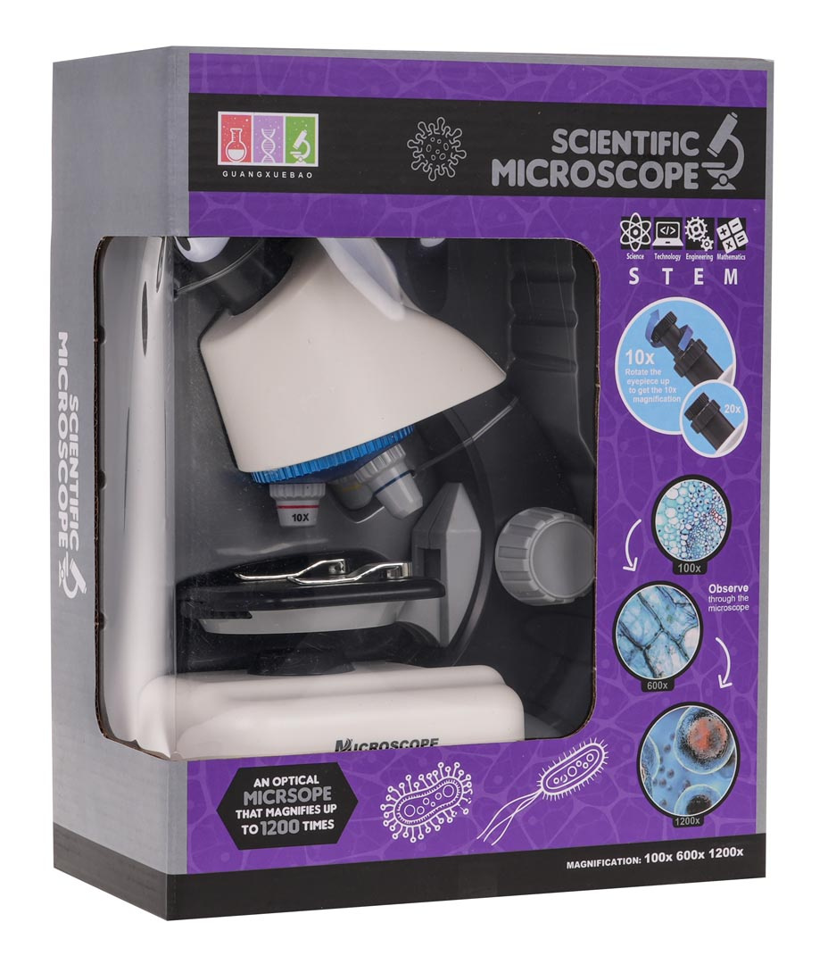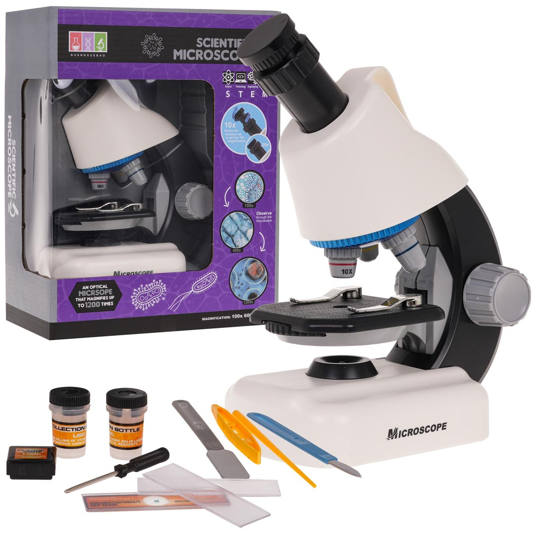 Mikroskop pro malého vědce od 6 let. Mikroskop byl vyroben z nejkvalitnějších materiálů, umožňuje pozorování objektů i při zvětšení 1200krát. V sadě s mikroskopem se nacházejí také příslušenství jako zkumavky, hotový preparát, 2 sklíčka na preparát, krabička na mikroorganismy nebo pinzeta. Mikroskop je napájen bateriemi typu 2 x AA 1,5 V (nejsou součástí balení).