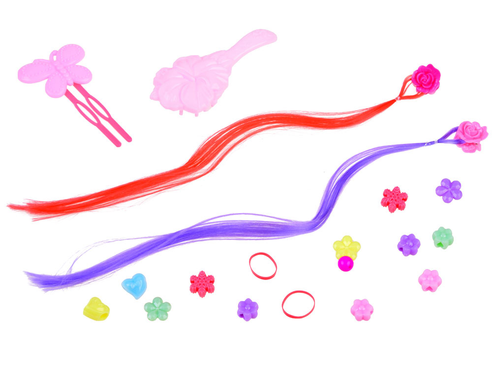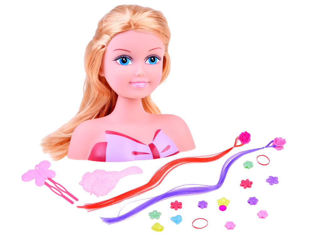 Elegantní česací hlava s dlouhými blond vlasy a doplňky pro tvorbu účesů jistě zaujme každou malou kadeřnici. Modelka má dlouhé blond vlasy upravené dvěma barevnými prameny fialové a červené barvy.Sponky do vlasů, korálky na zaplétání a copánky ozdobí každý účes vytvořený malou kadeřnicí.